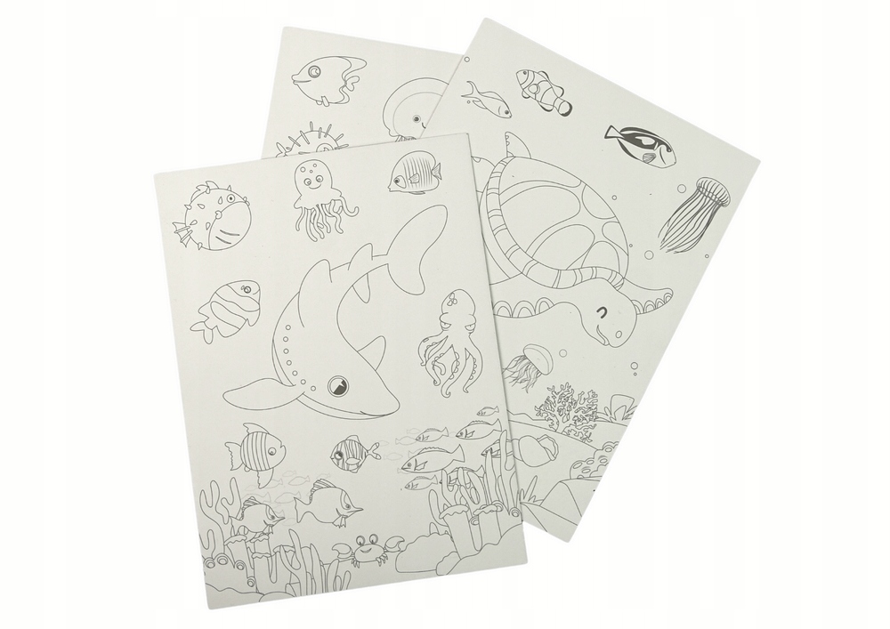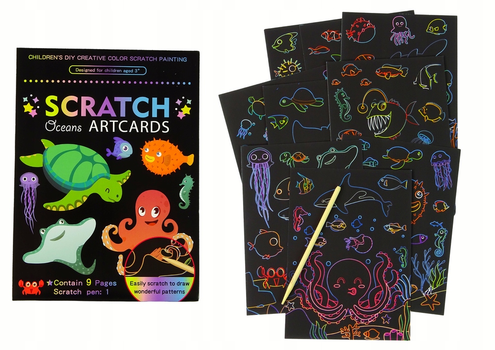 - У набір входить 9 малюнків, які оживають на очах у дитини. Забавка проста: за допомогою спеціальної дерев’яної палички ви можете подряпати чорний шар на малюнку, відкриваючи красиві та барвисті ілюстрації. Ці ілюстрації показують різні сцени з підводного світу.