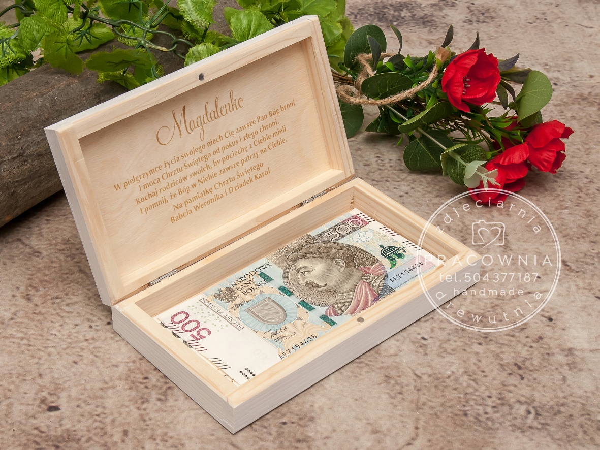 Іменне гравіювання на кришці скриньки та присвята всередині — оригінальна пропозиція гарного сувеніра і водночас ящик для грошей - все готове до віддачі.