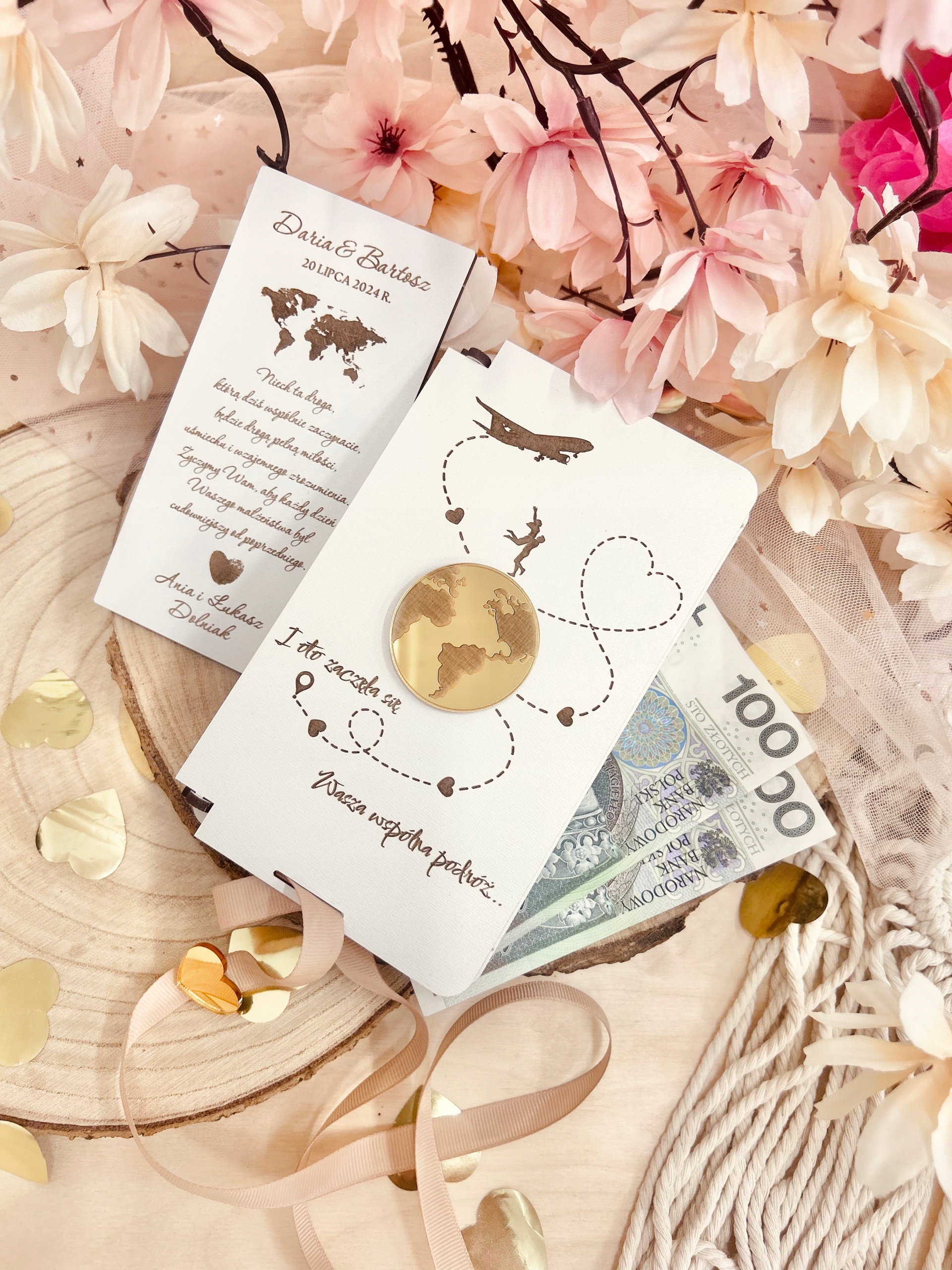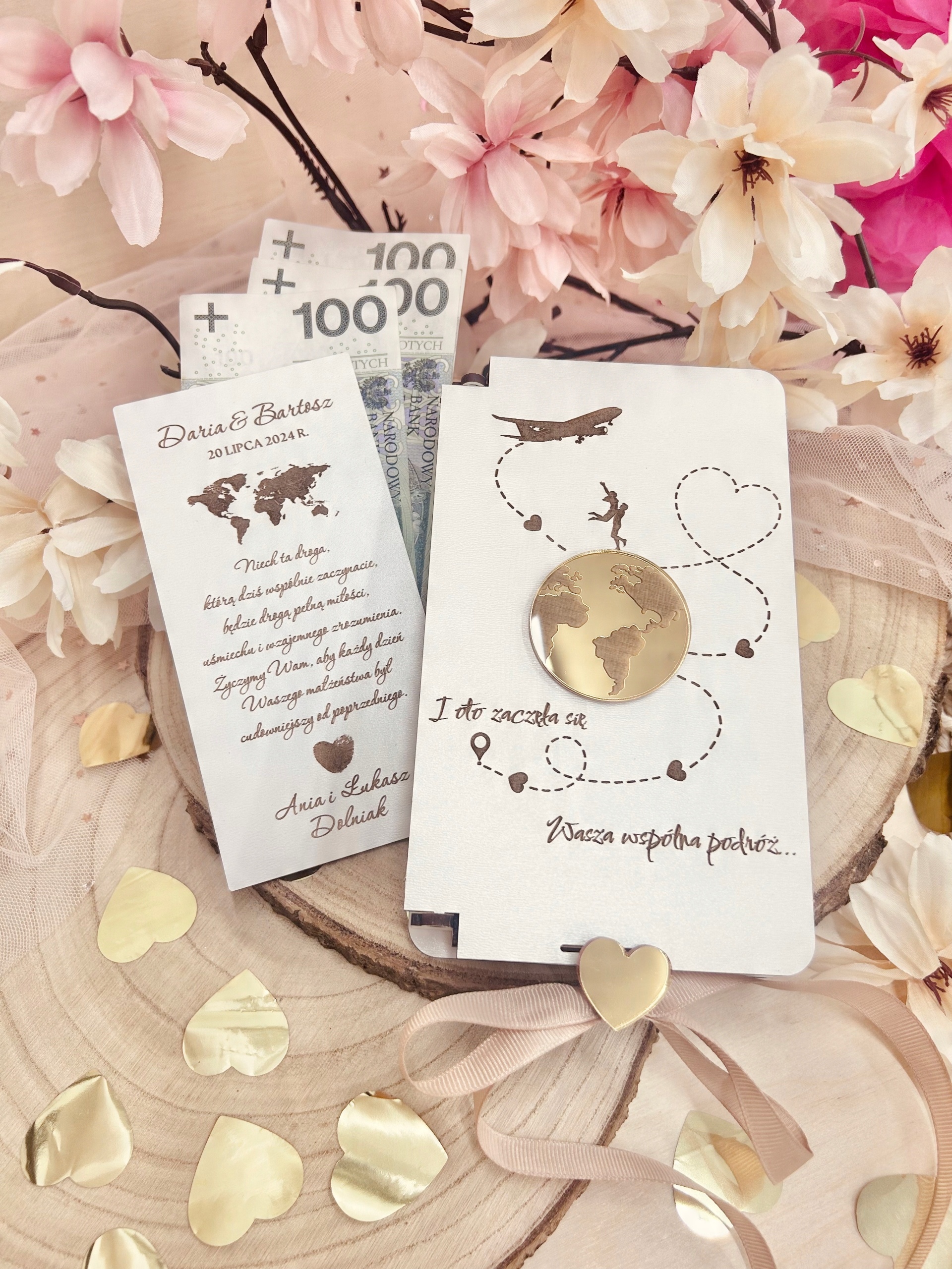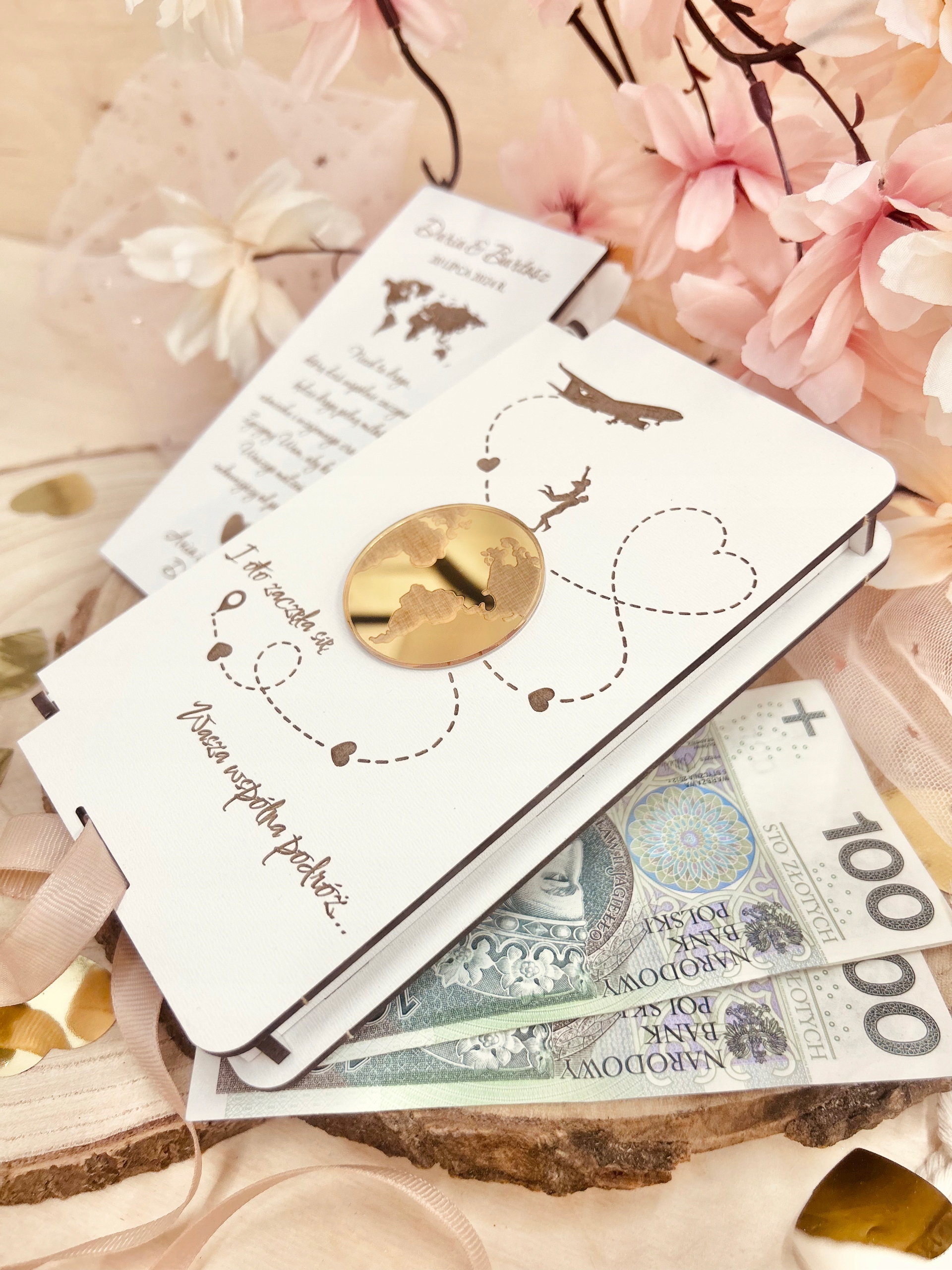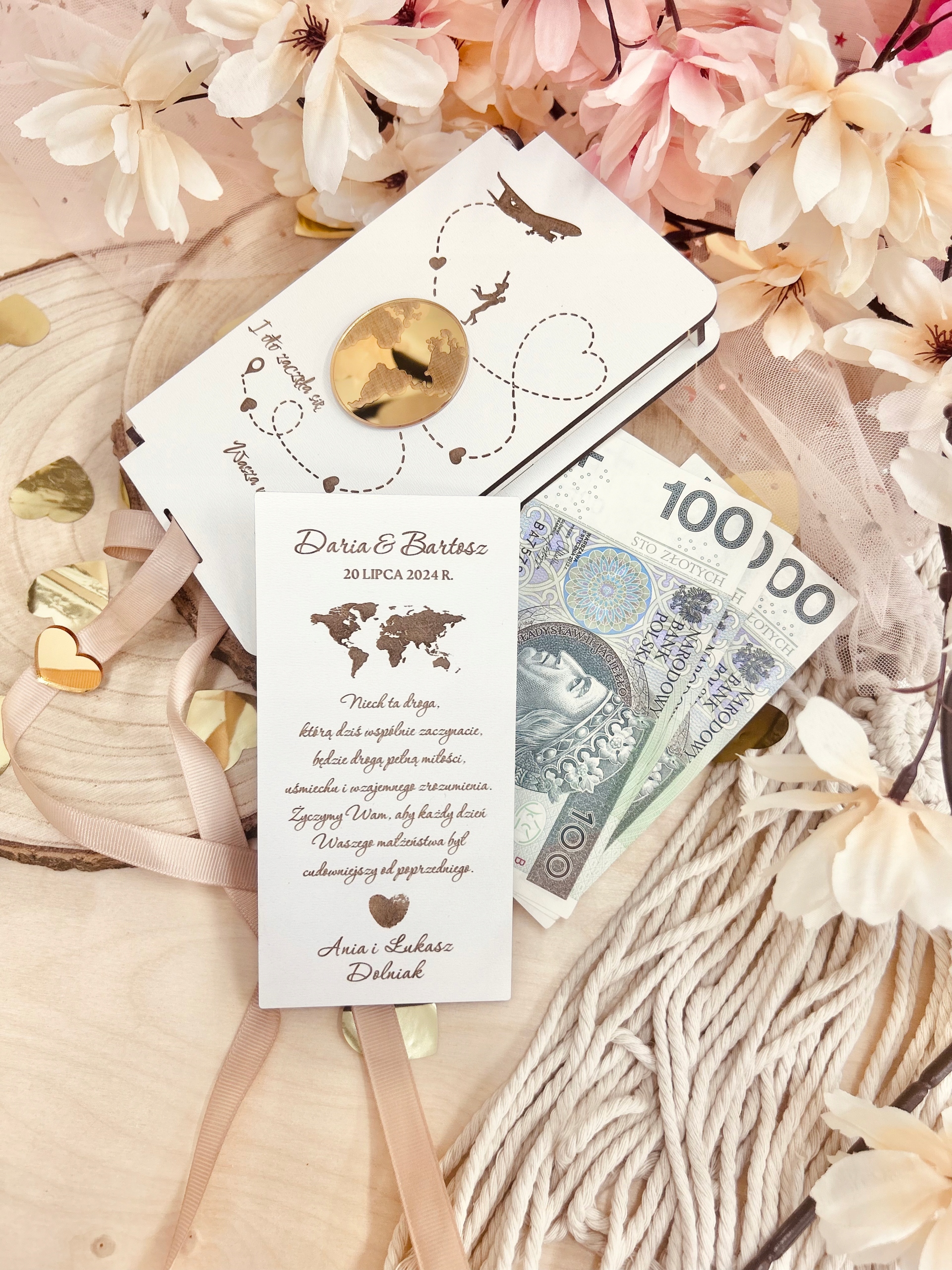 У коробці є імена нареченого та нареченої, дата церемонії, побажання та підпис, який можна персоналізувати. У коробку можна вмістити банкноти та інші дрібні подарунки, наприклад, скретч-картки чи купони.