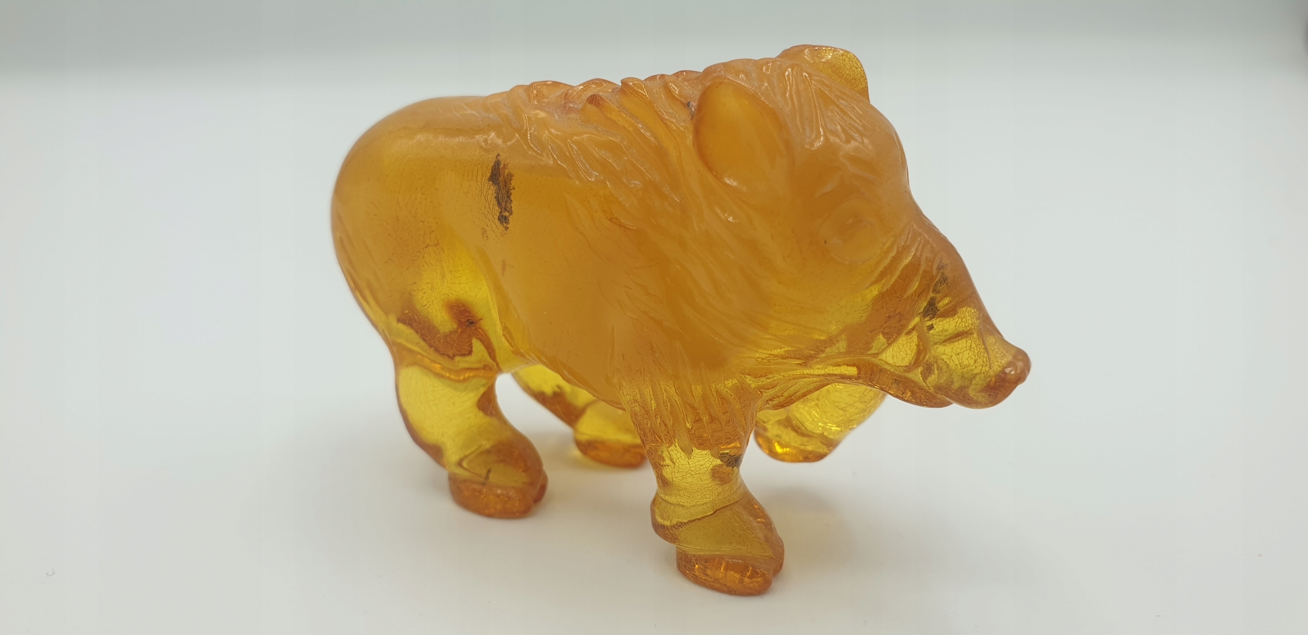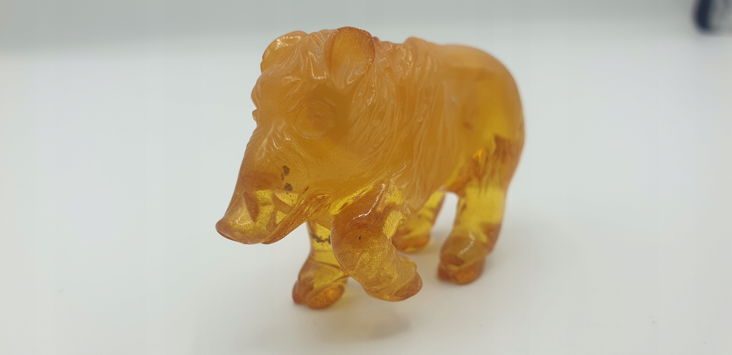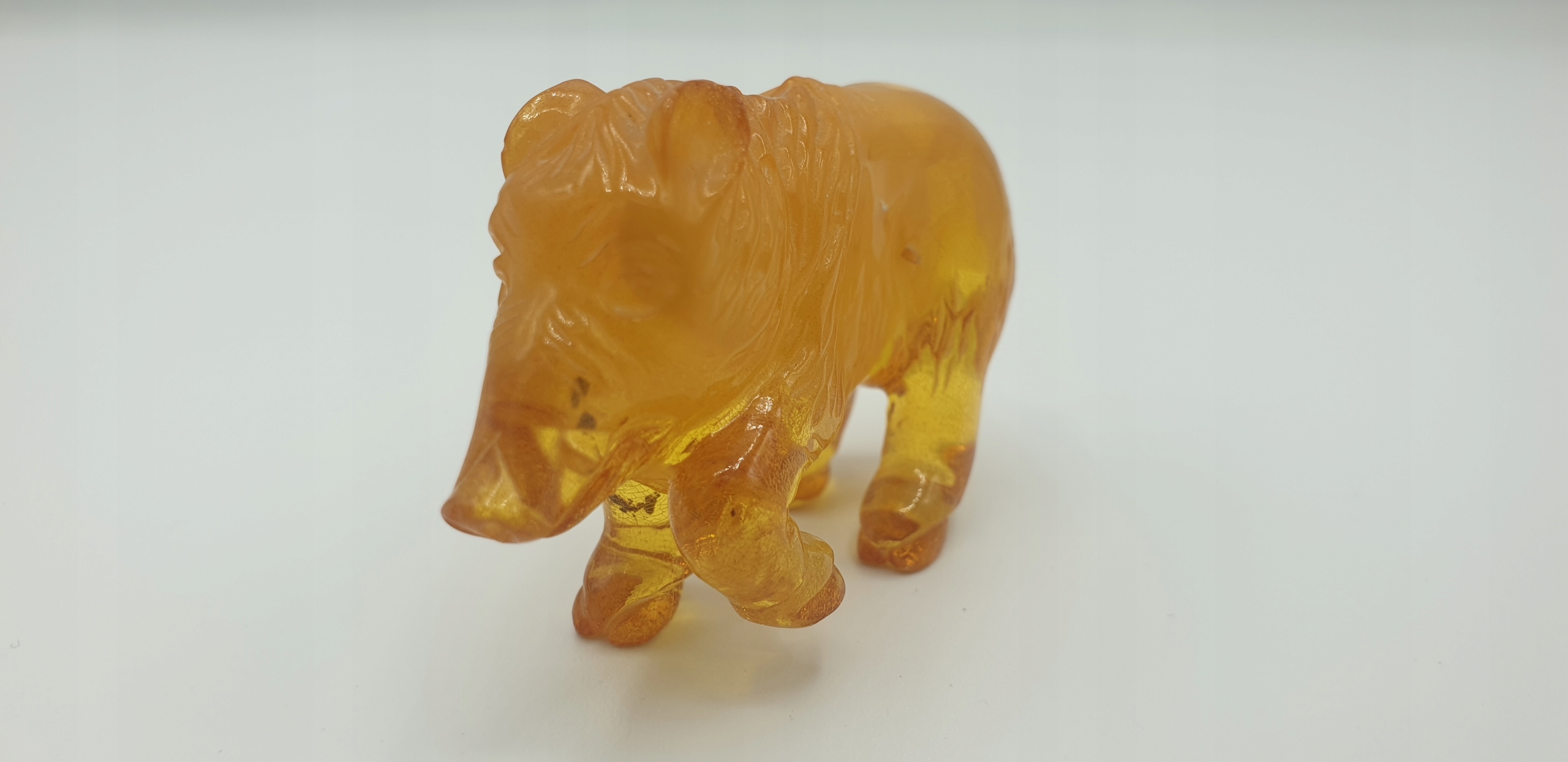 Скульптура дикого кабана, виготовлена вручну з цілісного шматка балтійського бурштину світло-молочного кольору.