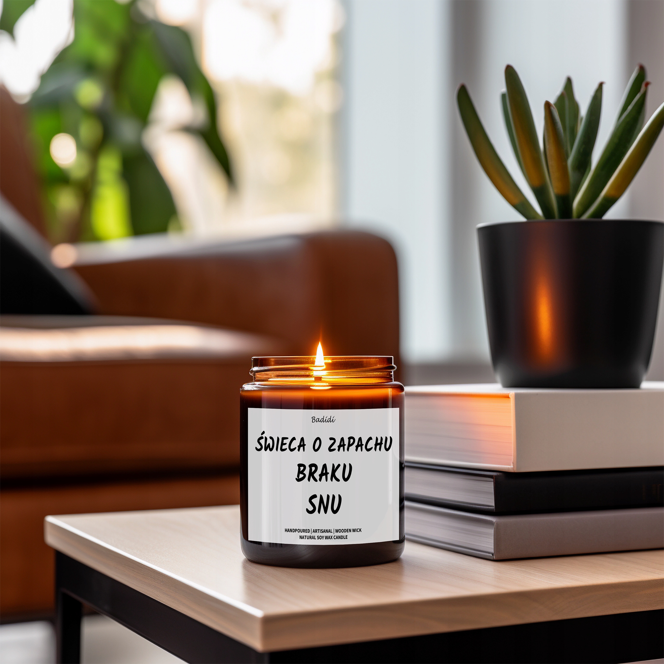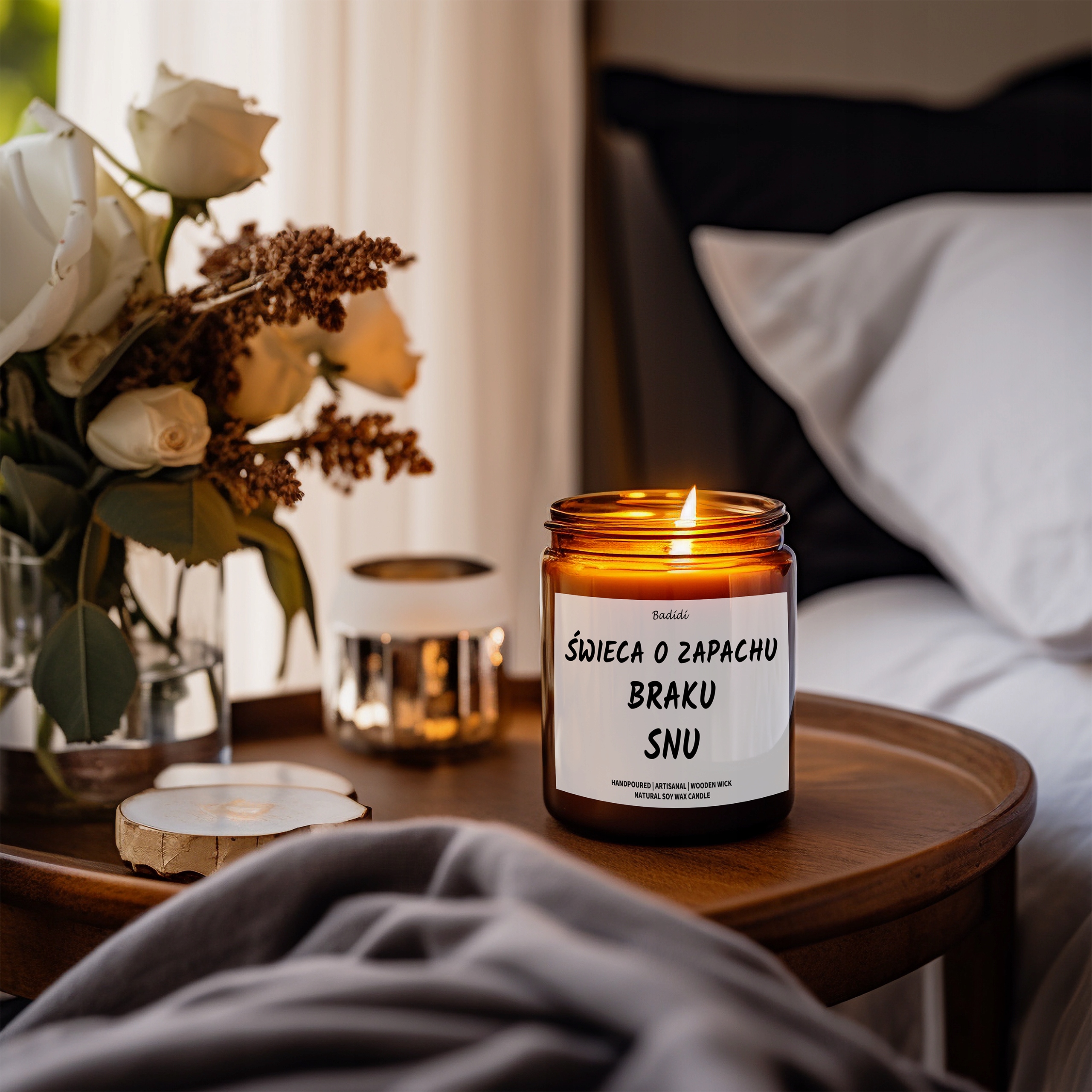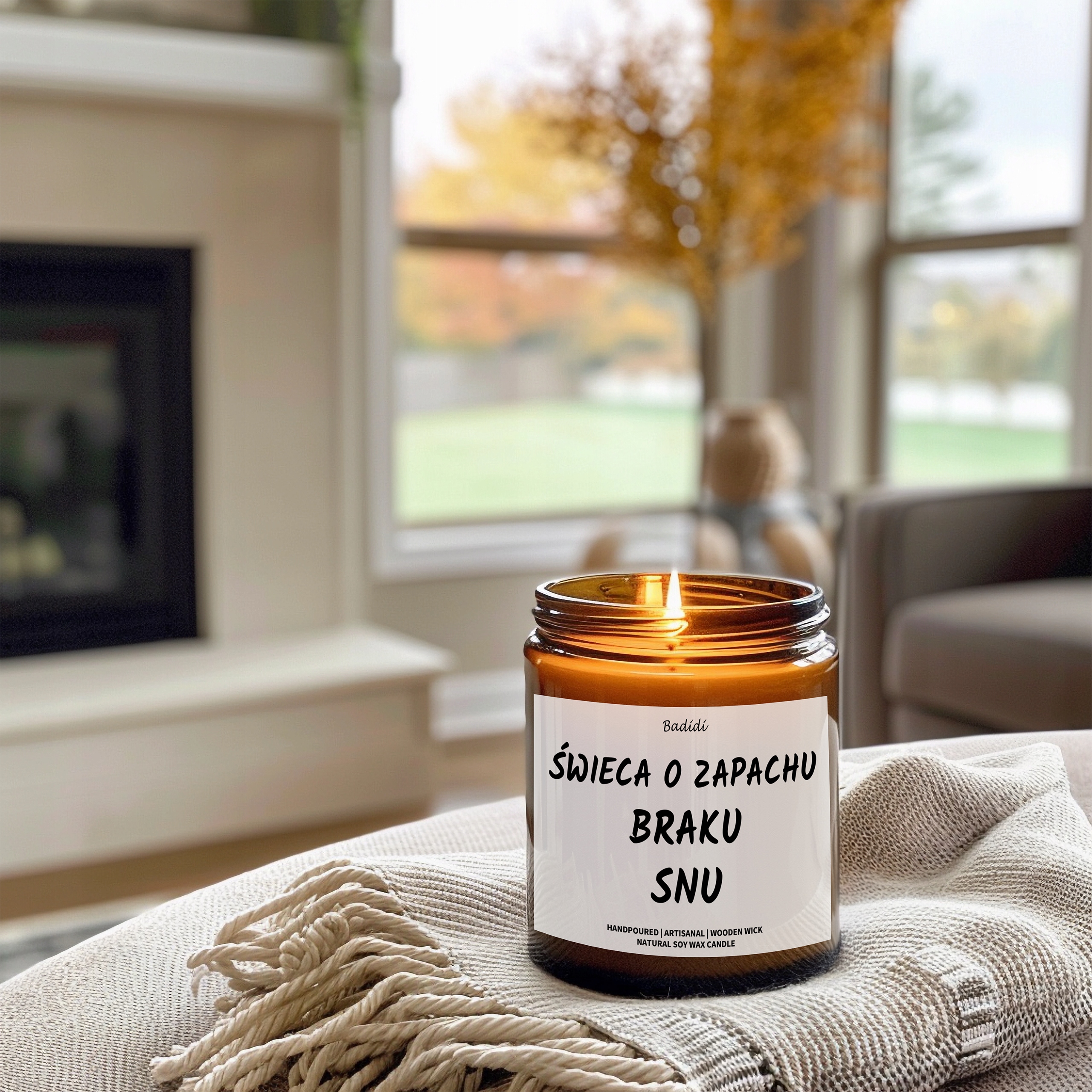 Соєва свічка з ароматом кумедного тексту "СВІЧКА ІЗ ЗАПАХОМ СНУ" - чудовий подарунок собі або близькій людині, другу чи колезі, який страждає чи буде страждати від хронічного недосипання у зв'язку з народженням дітей.