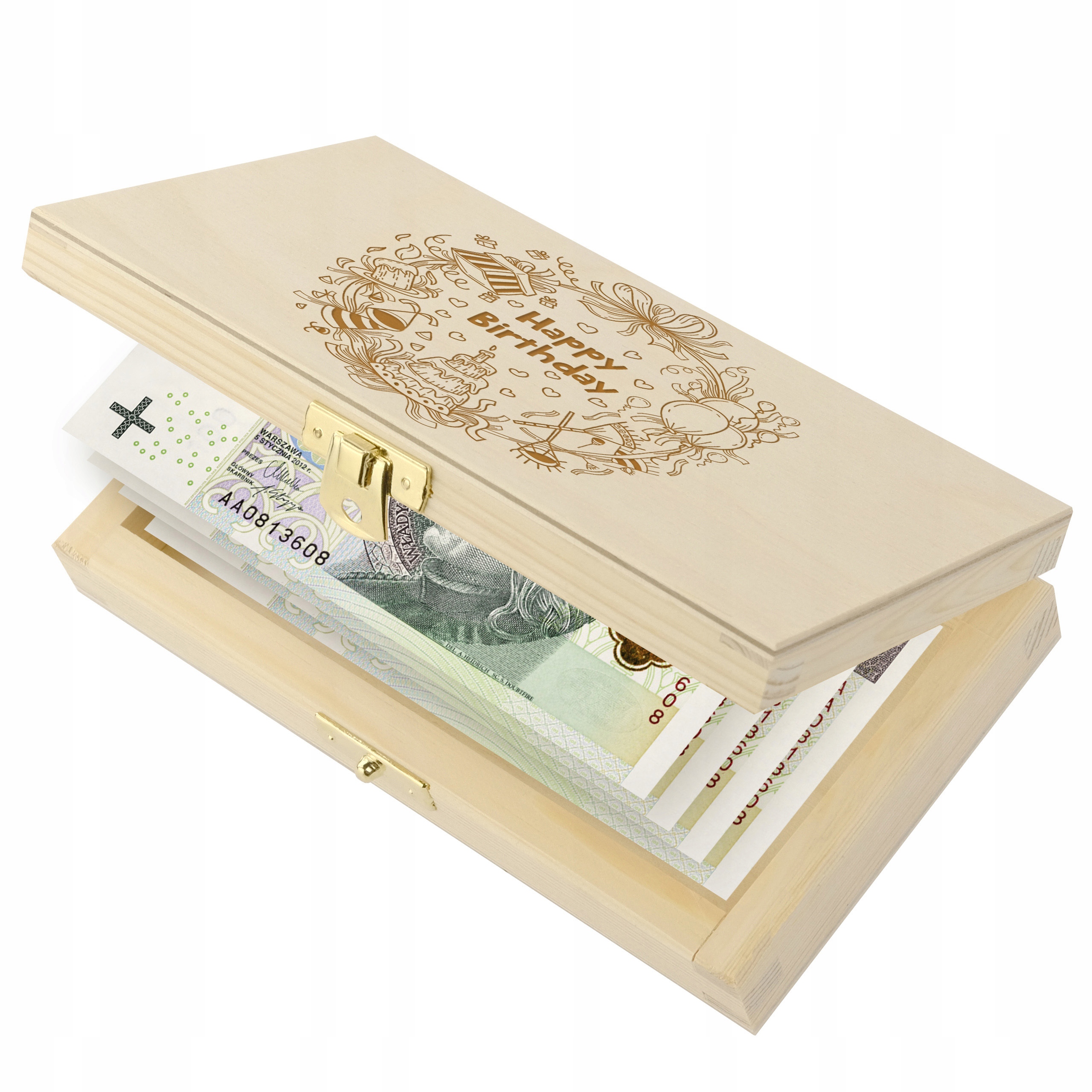 Персоналізована коробка виконує дві функції. Це стильний футляр для банкнот, а вигравірувані на ньому побажання замінюють звичайну картку. Таке рішення - відмінна ідея урізноманітнити такий подарунок, як гроші.