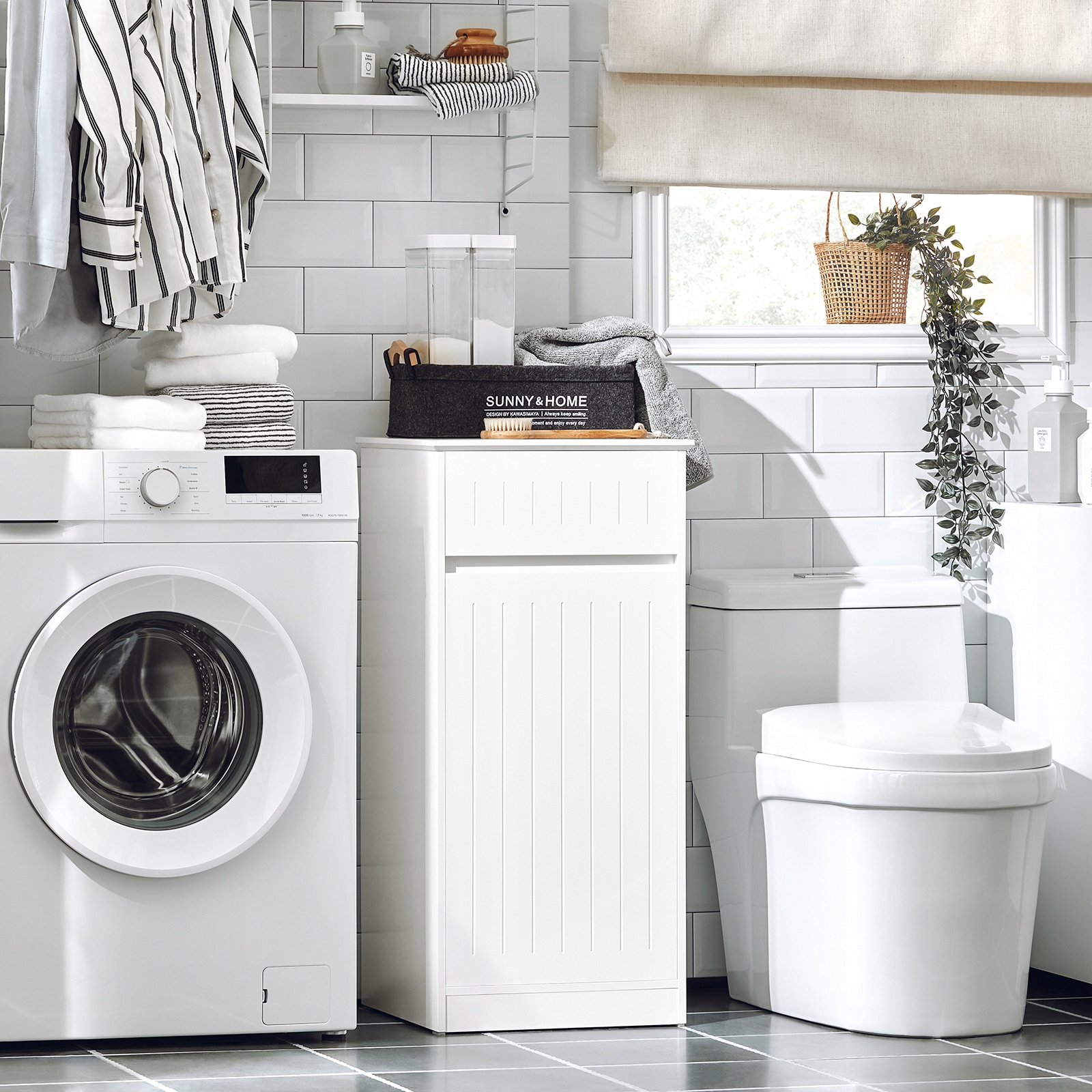 Цей кошик для білизни забезпечує додатковий простір для зберігання та водночас розширює вашу ванну кімнату. Повсякденне приладдя та брудну білизну можна покласти в пральню за відкидними дверцятами, щоб вони завжди були під рукою.