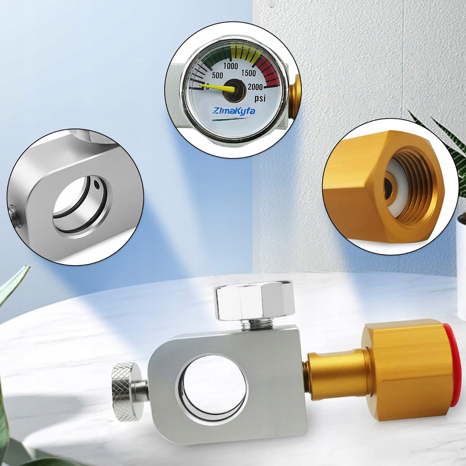 💹Унікальний дизайн: адаптер для наповнення газованої води має власний манометр, за допомогою якого зручно зчитувати значення тиску, гарантуючи, що воно не перевищить тиск специфікації приймального резервуара, він безпечний і надійний. Продукт підходить для додавання CO2 з великого резервуара CO2 в малий резервуар CO2. Різьба великого резервуара Co2 має відповідати стандарту Європейського Союзу W21.8