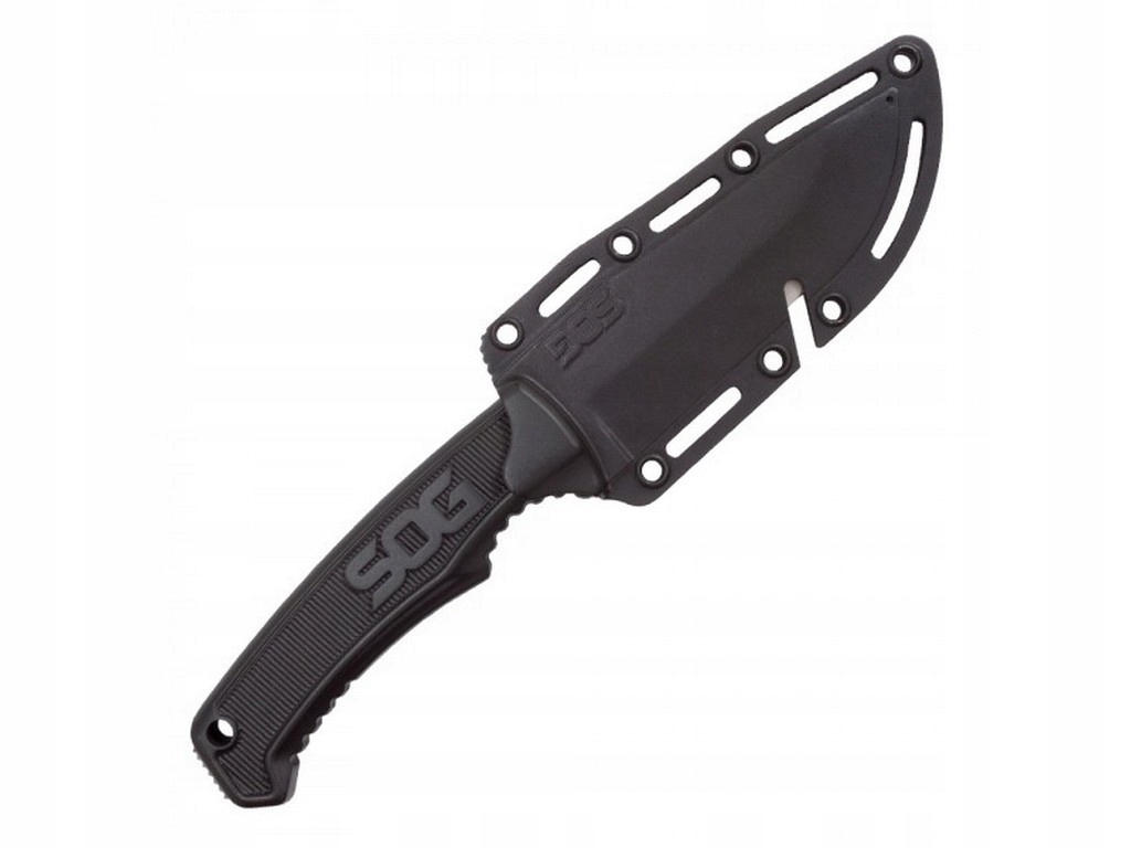 Ручка ножа з чорної ручки SOG з чорною ручкою виготовлена з довговічного та стійкого до погоди пластику, покритий спеціальним матеріалом, який забезпечує надійне та зручне зчеплення навіть у вологих умовах. Ручка також має отвір для кабелю, що полегшує прикріплення ножа до рюкзака або іншого обладнання.