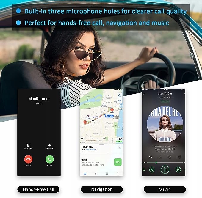 - 【Три отвори для збору звуку та кнопка «MFB»】Цей бездротовий аудіоадаптер має три отвори для збору звуку та одну кнопку «MFB» для відповіді/повторного набору/відключення/відхилення дзвінків, що допомагає вам здійснювати дзвінки без використання рук. Він також підтримує трансляцію голосових сповіщень із наявної програми навігації. Вам не потрібно дивитися на телефон під час руху. Переконайтеся, що ви керуєте безпечно.