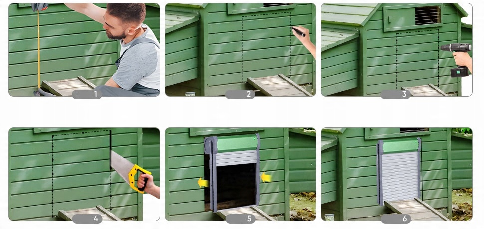 алюмінієві двері до курки легко встановити. Ви можете правильно встановити їх, дотримуючись інструкцій у посібнику користувача. ПРИМІТКА: Бруд на рейках та Дверні панелі повинні періодично очищати (очищення раз на тиждень) , особливо після дощу чи снігу.