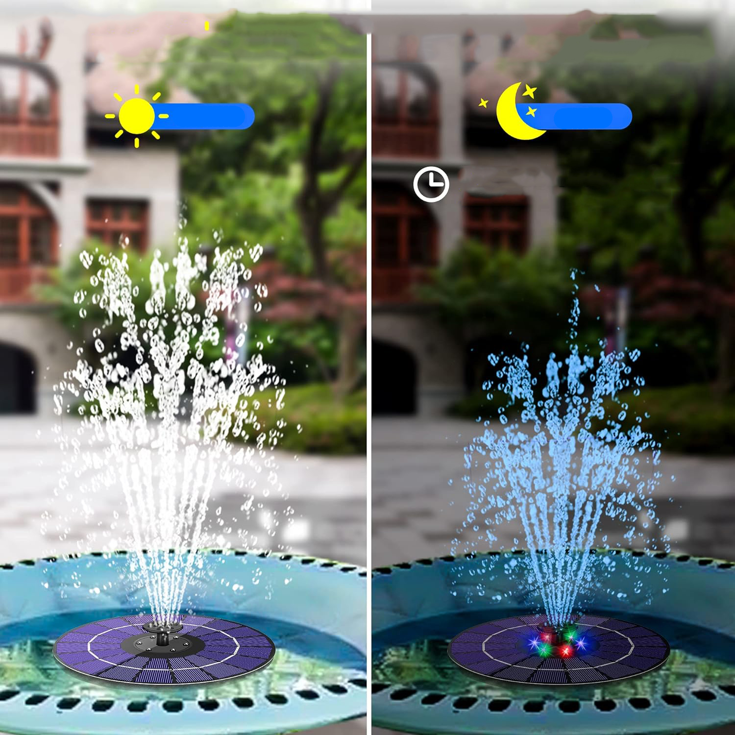 ⛲⛲ 6 кольорових світлодіодів -насос для ставу працює протягом дня з достатньою кількістю сонячного світла і завантажує зайвий струм до вбудованого акумулятора, завдяки якому він автоматично розпорошує воду вночі і світить барвистим світлом у саду приблизно 3-5 годин.