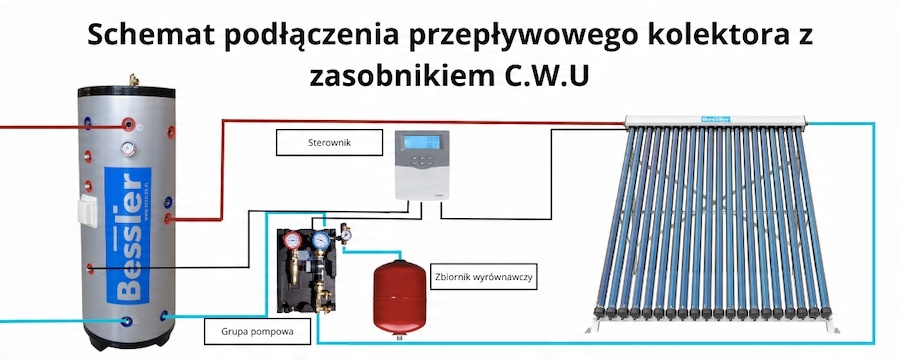 Принцип роботи: Сонячний колектор використовує енергію сонячного випромінювання для виробництва тепла. Колекторні труби містять середовище, яке нагрівається сонячним світлом. Це тепло передається нагрівальній рідині (гліколь або вода),яка циркулює в системі. Рідина надходить у резервуар, де зберігає тепло для подальшого використання.