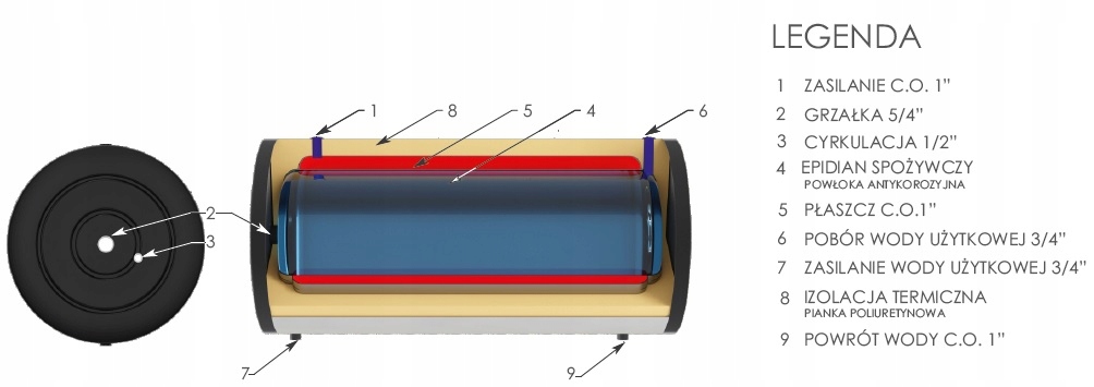 У нижній частині горизонтального резервуару є з'єднання з електричним нагрівачем 5/4 ', ½' і *входом до датчика температури ( *застосовується лише до танків у 200 л, 250 л, 300 л). Живлення та повернення в систему, яка становить 1 ', тоді як джерело живлення та повернення до гарячої комунальної води - ¾' '. Танк може бути встановлений де завгодно через конструкції та систему муфів. Блок живлення може бути поверненням, а спина живлення - живлення. Це стосується як з'єднання з водним котлом Co, так і для з'єднання з гарячою водою. Перевага кожного резервуара - отвір для електричного нагрівача, розташованого посередині дна. Цей тип рішення дає комфорт у ситуації, коли джерело тепла, наприклад Котел гасне - дозволяє отримувати гарячу воду за короткий проміжок часу. Двохросовий обмінник може бути встановлений де завгодно через конструкції та систему муфів. Блок живлення може бути поверненням, а спина живлення - живлення. Це стосується як з'єднання з водним котлом Co, так і до гарячої води гарячої води.
