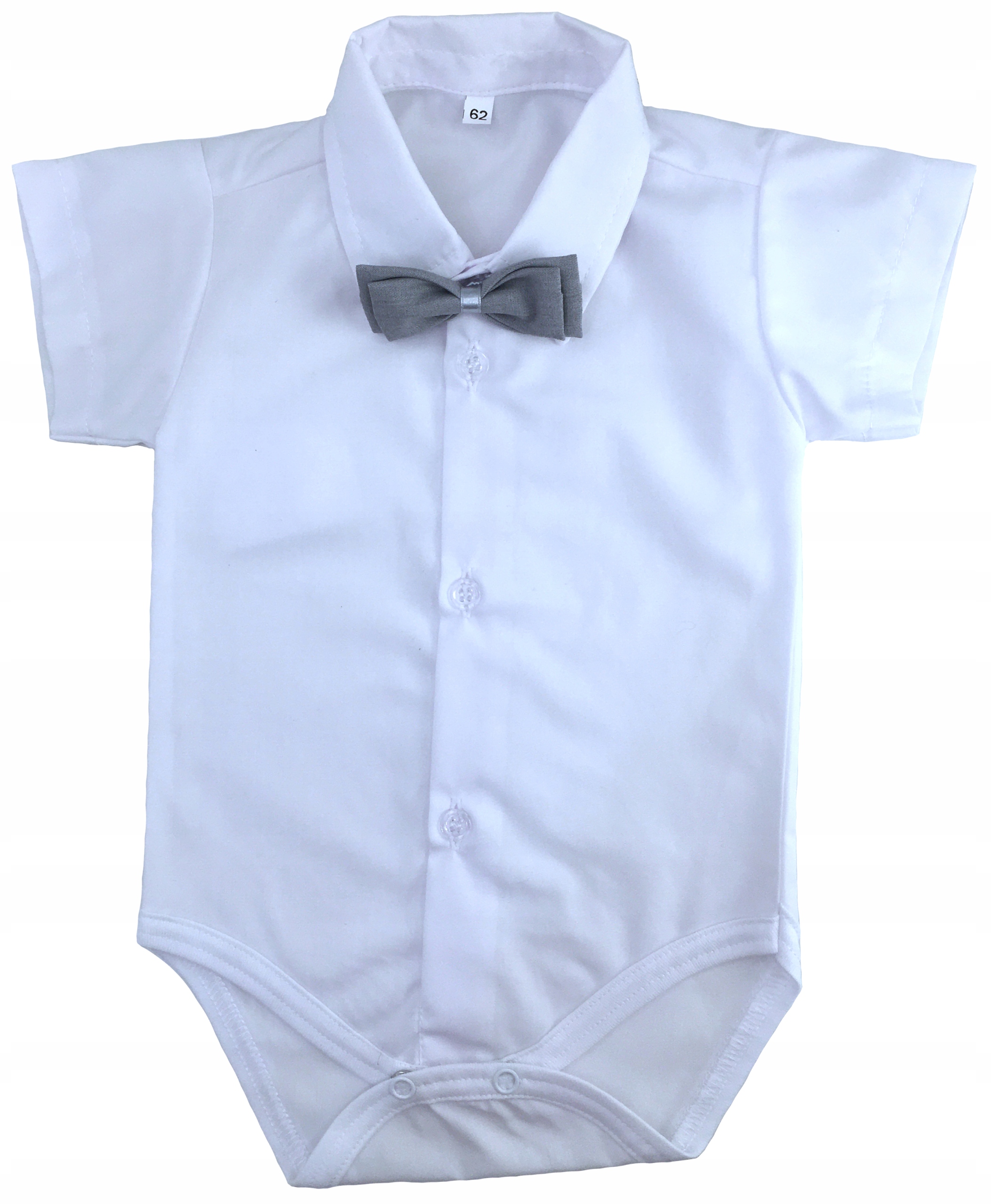Біла офіційна сорочка-боді з коміром і короткими рукавами для хлопчика. Сірий метелик на стрічці. Можливість заміни кольору краватки-метелика на інший на аукціоні.