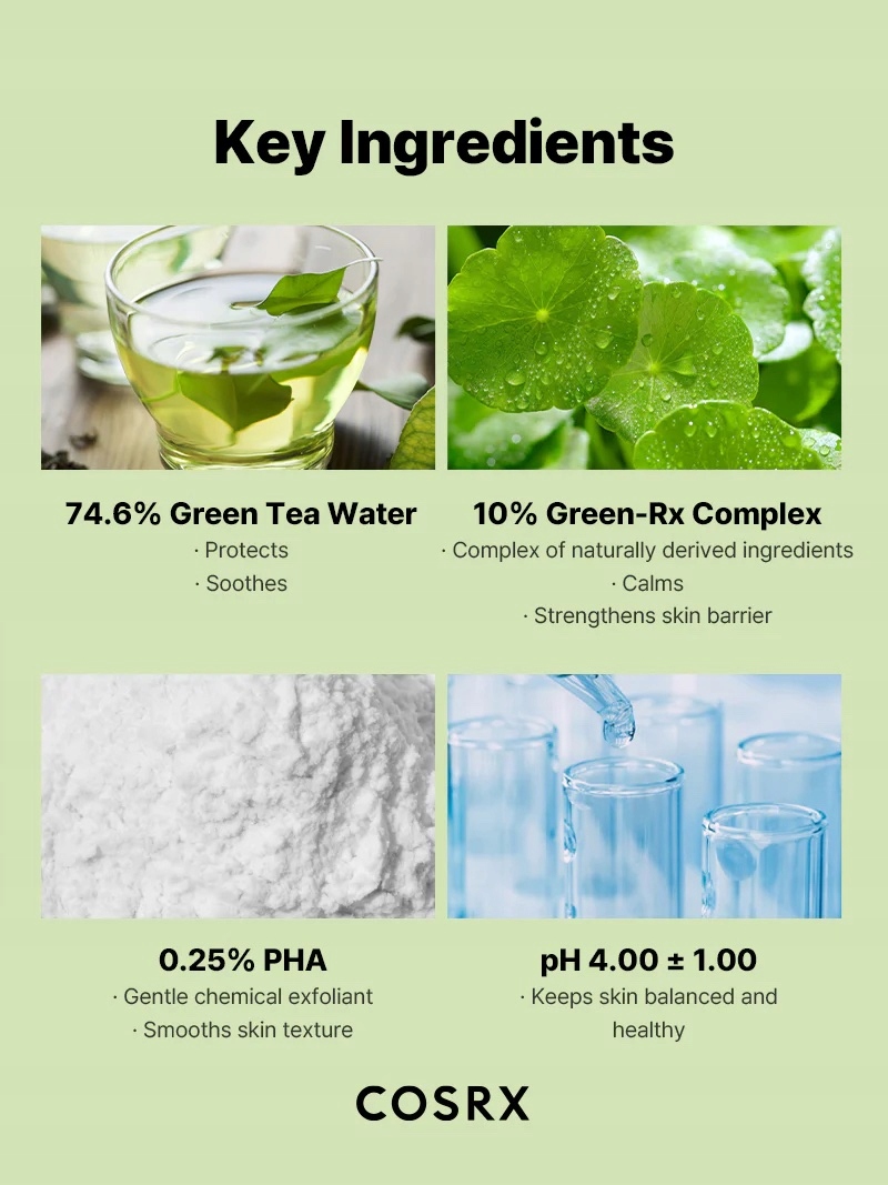 Дія цих подушечок полягає в відлущуванні слабкою кислотою із заспокійливими властивостями для чутливої шкіри за допомогою води зеленого чаю 75%, PHA 0,25% і комплексу «Green-Rx», що складається з листя кульбаби, центелли азіатської, гамамелісу, листя екстракт чайного дерева та полину.