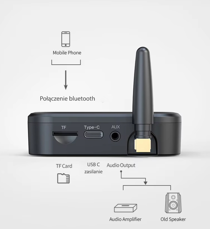 ➡ Замініть усі аудіо обладнання сучасним центром бездротової музики. Для будь -якого аудіозапусті з входом AUX - незалежно від того, чи це стара вежа, динамік, набори автомобіля чи домашнє кінотеатр.