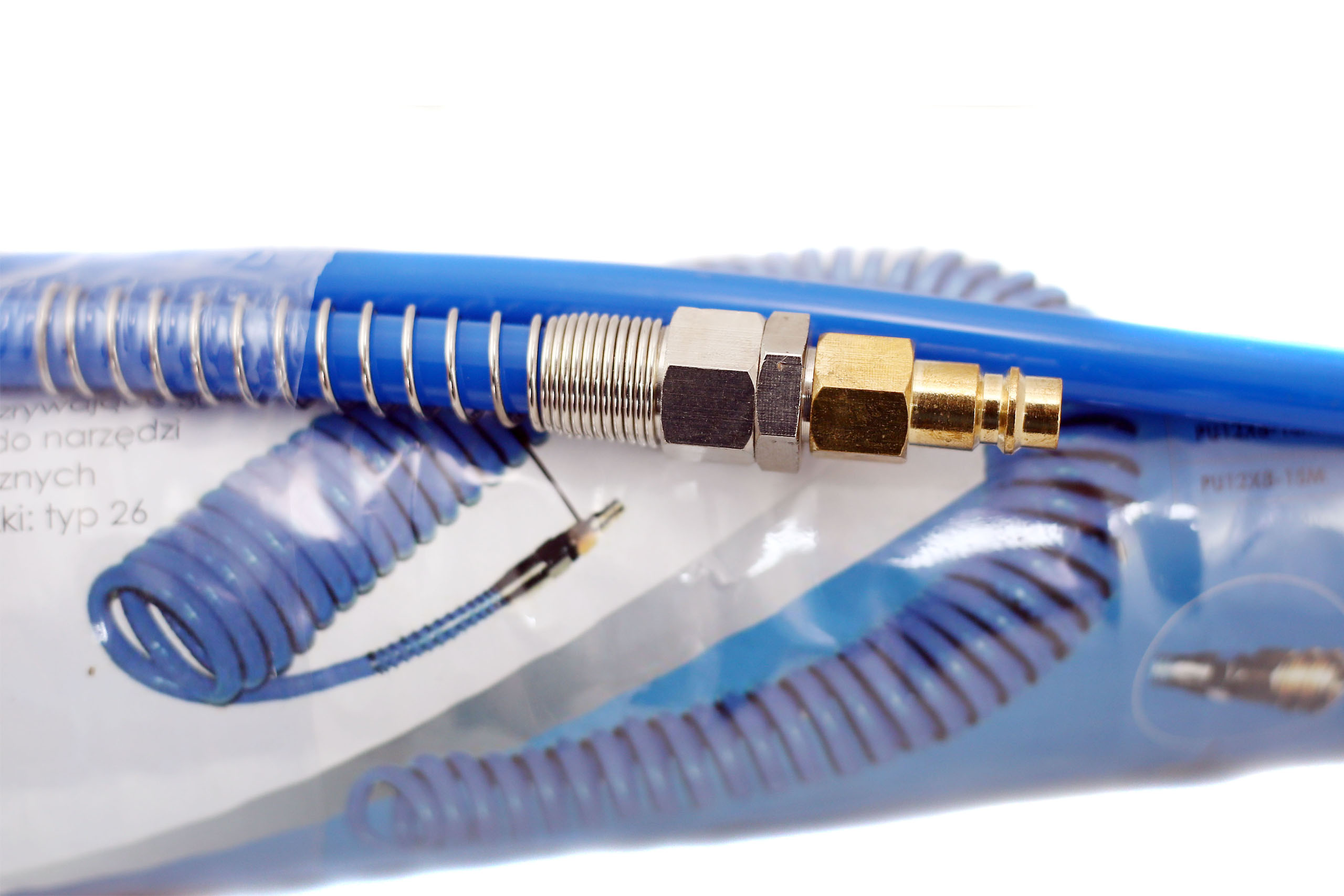 спіральний пневматичний шланг з високою швидкістю. Призначені для роботи в галузях, гаражах, майстернях - тобто там, де використовуються пневматичні пристрої. Полегшує та прискорює з'єднання компресора з пристроями. Неймовірно, щоб накачувати пістолети, дути, малювати, різні типи пневматичних клавіш, мастила та інші інструменти. Він витримує велику температуру. Виготовлений з поліуретану, стійкого до тріщин, він має високий тиск, що розривається (в порядку 30 бар). Спіральність змії дуже корисна під час зберігання та транспортування. Після складання шланг покриває близько 10% від загальної довжини.
