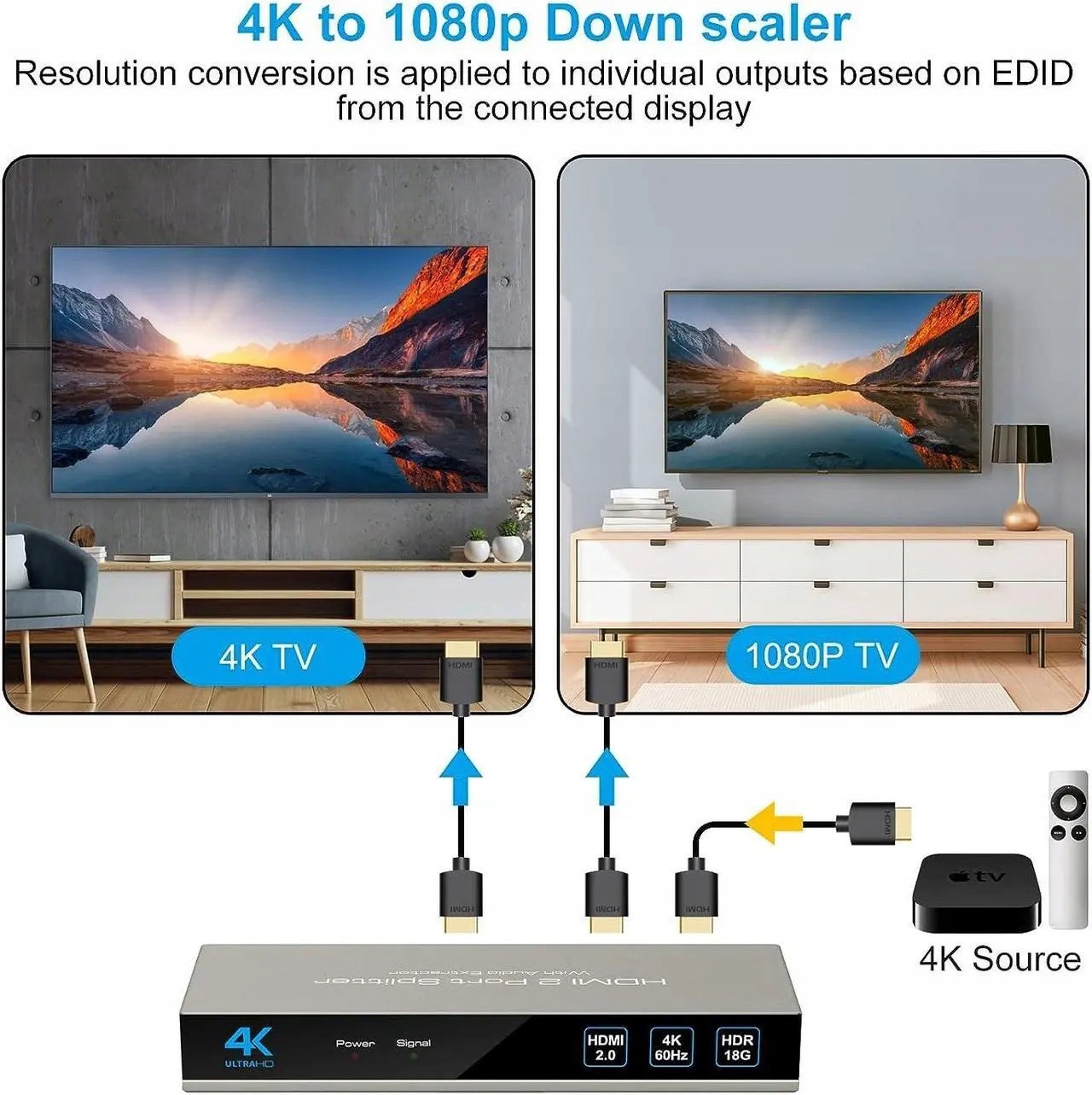 [HDMI SPLITTER та 4K@60 Гц аудіо екстрактор] HDMI SPLITURE 1 IN OUT з аудіовиписником. Він може дублювати/скопіювати 1 сигнал HDMI на 2 дисплеї HDMI одночасно та витягуйте аудіосигнали з будь -якого джерела HDMI без виділеного аудіо -виводу.