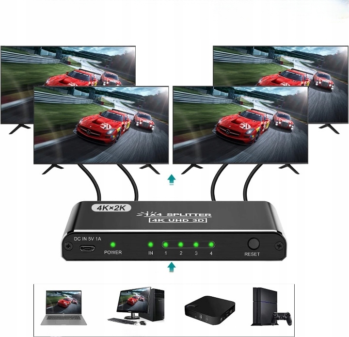 розповсюджувач HDMI 1x4 відокремлює аудіо- та відеосигнал від одного джерела в 4 дисплеї HDMI одночасно, забезпечуючи високу якість відео/аудіо без зволікань, блиску та зменшення роздільної здатності. Це не вимагає зовнішнього контролера: просто підключіть пристрої HDMI та USB -живлення (включений). Він широко використовується в цифрових розважальних центрах, роздрібних магазинах та HDTV, HDTV, STB, DVD, PS3 та фабрикам проекторів, а також у питаннях, пов'язаних із простором та безпекою. І аудіо формат HDMI однаковий, коли підключують пристрій, що відображає, з іншою роздільною здатністю, зображення може не відображатися. 4 Розсіювання тепла та довговічність можна додатково збільшити порівняно з пластиком.