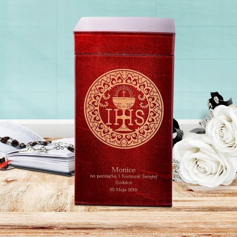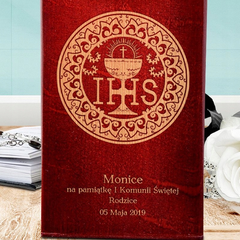 На коробці ми вигравіруємо Гостию - як на фото, ім'я дитини, текст "на згадку про Перше Святе Причастя", Ваш підпис і дата причастя.