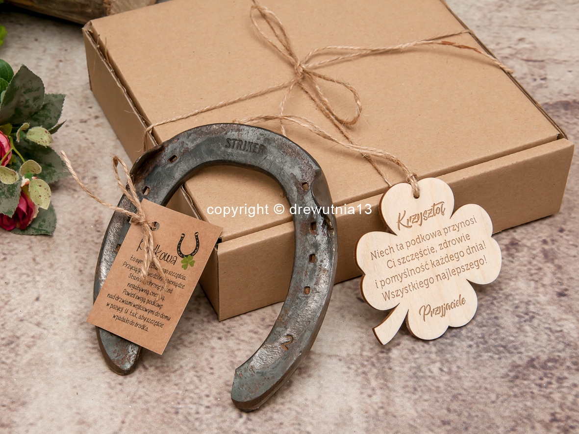 Кожна підкова (ми надсилаємо випадковим чином) має різний вимір і форму (немає двох однакових, кожна підкова різна - унікальна) зі слідами іржі, використовуючи коня та сіно прямо зі стайні. Ми визначаємо продукт як новий, оскільки готуємо весь набір спеціально для вас (підвіска, конюшина з гравюром) та упаковуємо в нову коробку. Весь виглядає дуже естетично і готовим до представлення як оригінальний і стильний подарунок.