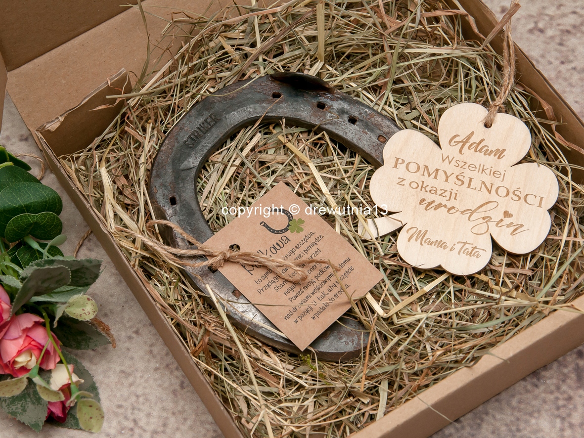 Кожна підкова (ми надсилаємо випадковим чином) має різний вимір і форму (немає двох однакових, кожна підкова різна - унікальна) зі слідами іржі, використовуючи коня та сіно прямо зі стайні. Ми визначаємо продукт як новий, оскільки готуємо весь набір спеціально для вас (підвіска, конюшина з гравюром) та упаковуємо в нову коробку. Весь виглядає дуже естетично і готовим до представлення як оригінальний і стильний подарунок.