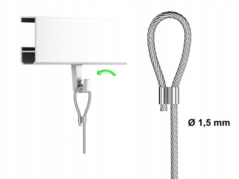 Сталевий трос із петлею кріпиться до рейки за допомогою гака для троса (входить у комплект). Зніміть та приєднайте шнур швидко та зручно!