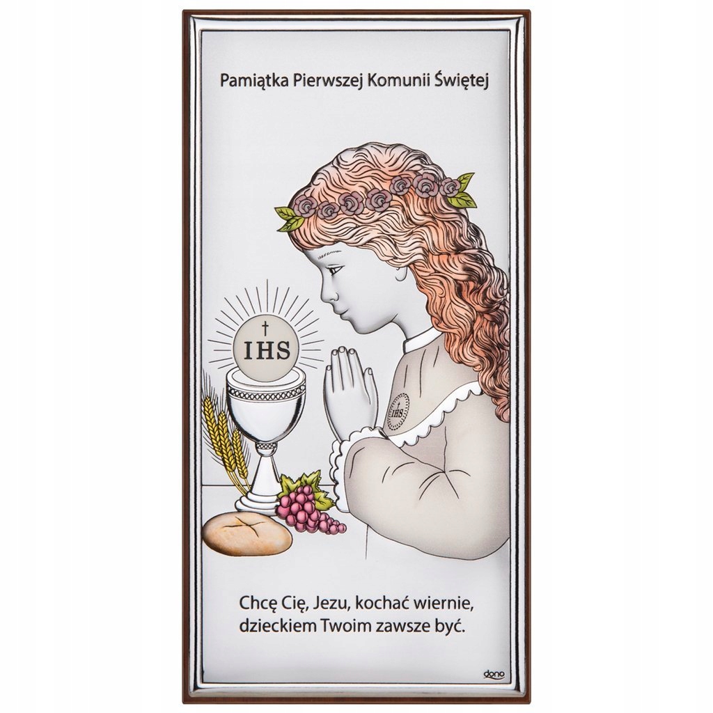 Срібна картинка з написом: «Сувенір Першого Святого Причастя» та написом: «Я хочу любити Тебе, Ісусе, вірно, бути Твоєю дитиною завжди. b>» із зображенням дівчини, що молиться, і чаші з Гостиєю.