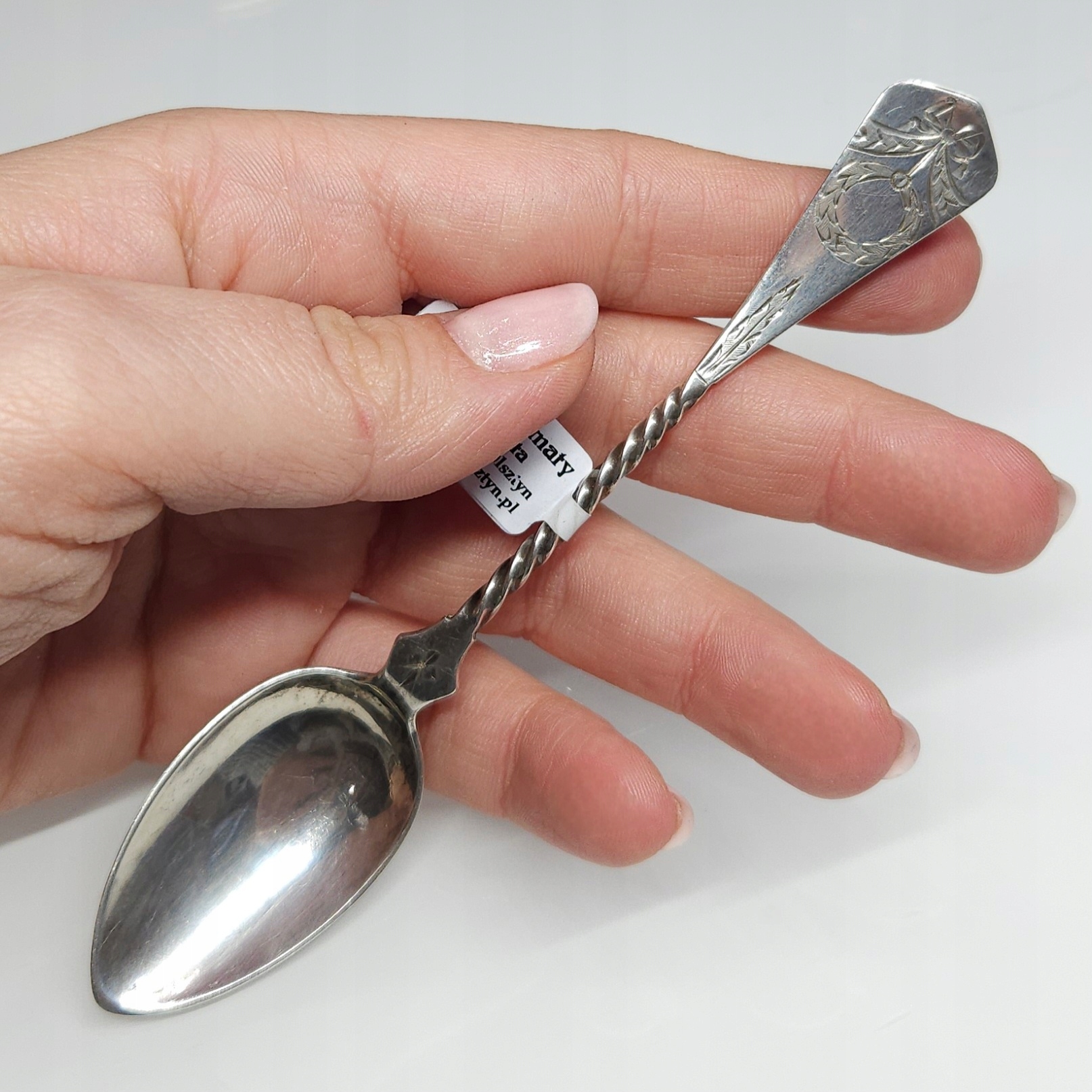 Предмет продажусрібна ложка з крученою ручкою, прикрашена мотивом ручного гравіювання гірлянди