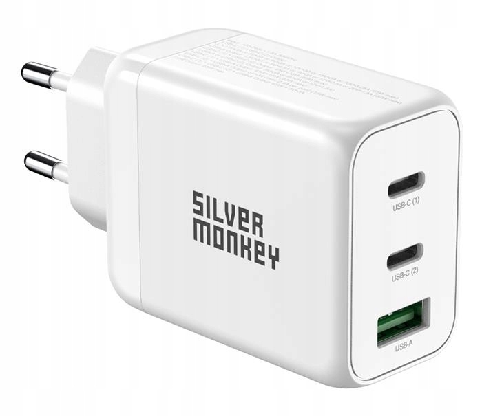 Срібна мавпа дозволяє одночасно заряджати три пристрої, оскільки він має один вхід USB-A та два USB-C. Цей універсальний зарядний пристрій підтримує технологію Qualcomm Quick Charge 3.0, яка дозволяє швидко заряджати та автоматично регулювати напругу смартфонів зарядки відповідно до стандарту QC 3.0.