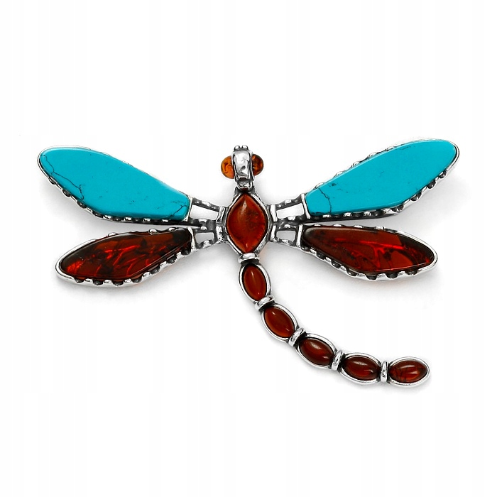 Ця красива барвиста бабка виготовлена зі срібла 925 проби й оправлена коричневим бурштином і синьою бірюзою .