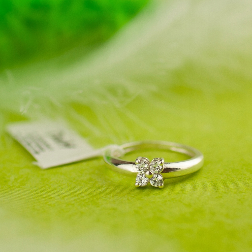 Красива, витончена каблучка, ідеальна для щоденного носіння. Радує своїм блиском симетрична квітка з чотирьох білих цирконів, розміщених у центральній композиції. Делікатний і позачасовий дизайн сподобається кожному любителю тонких прикрас.