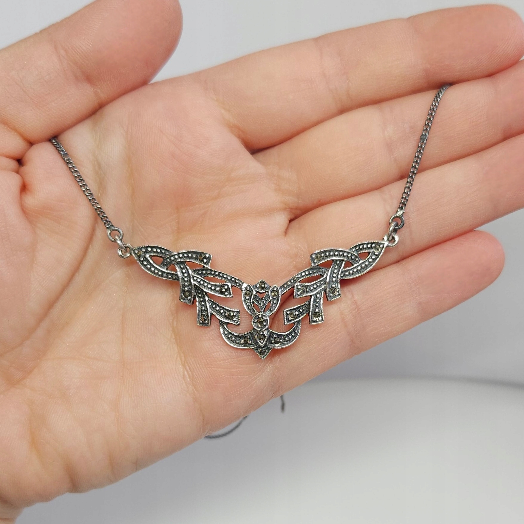 Предметом продажу єсрібне кольє з ажурним декоративним елементом, усипаним марказитами