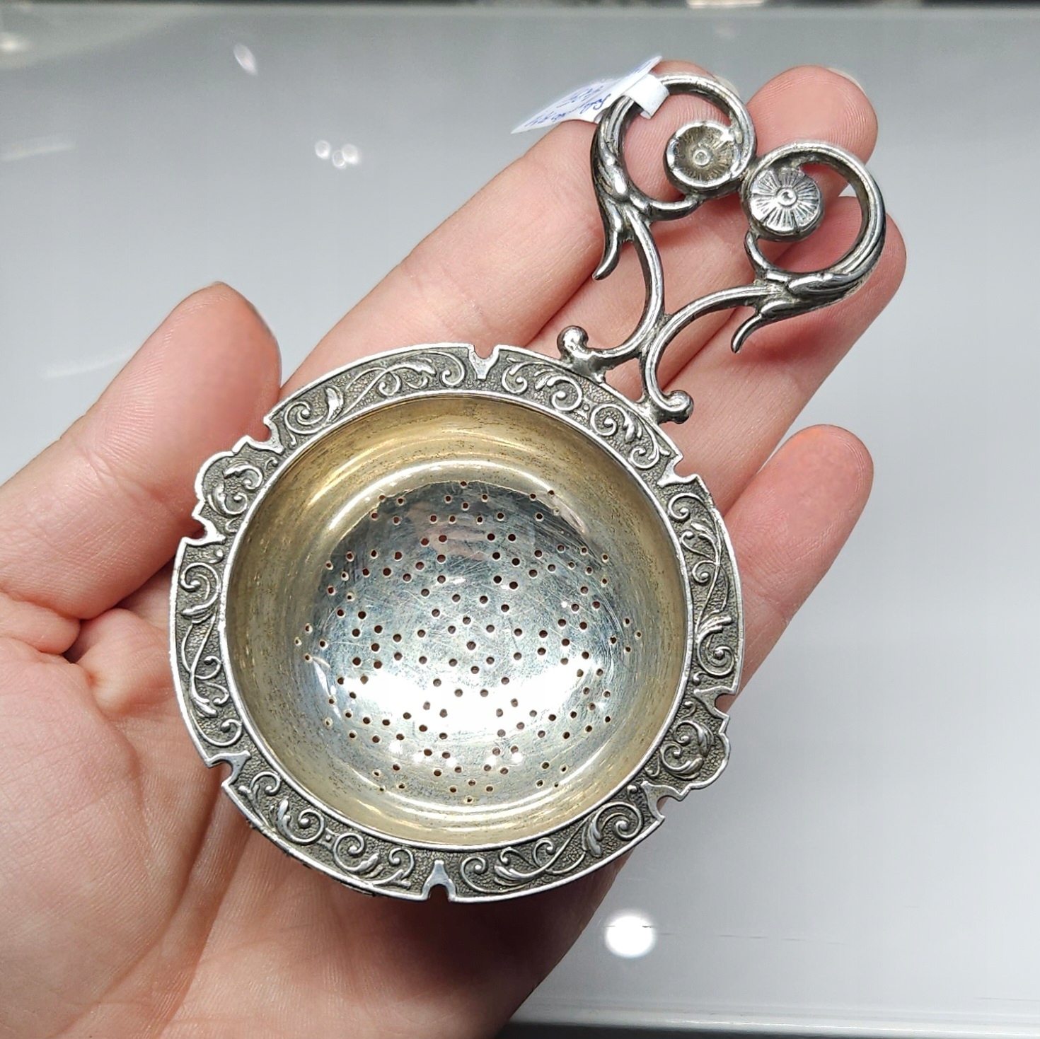 Предмет продажу срібне кругле ситечко з короткою декоративною ручкою, прикрашене тисненим декоративним орнаментом навколо черпака