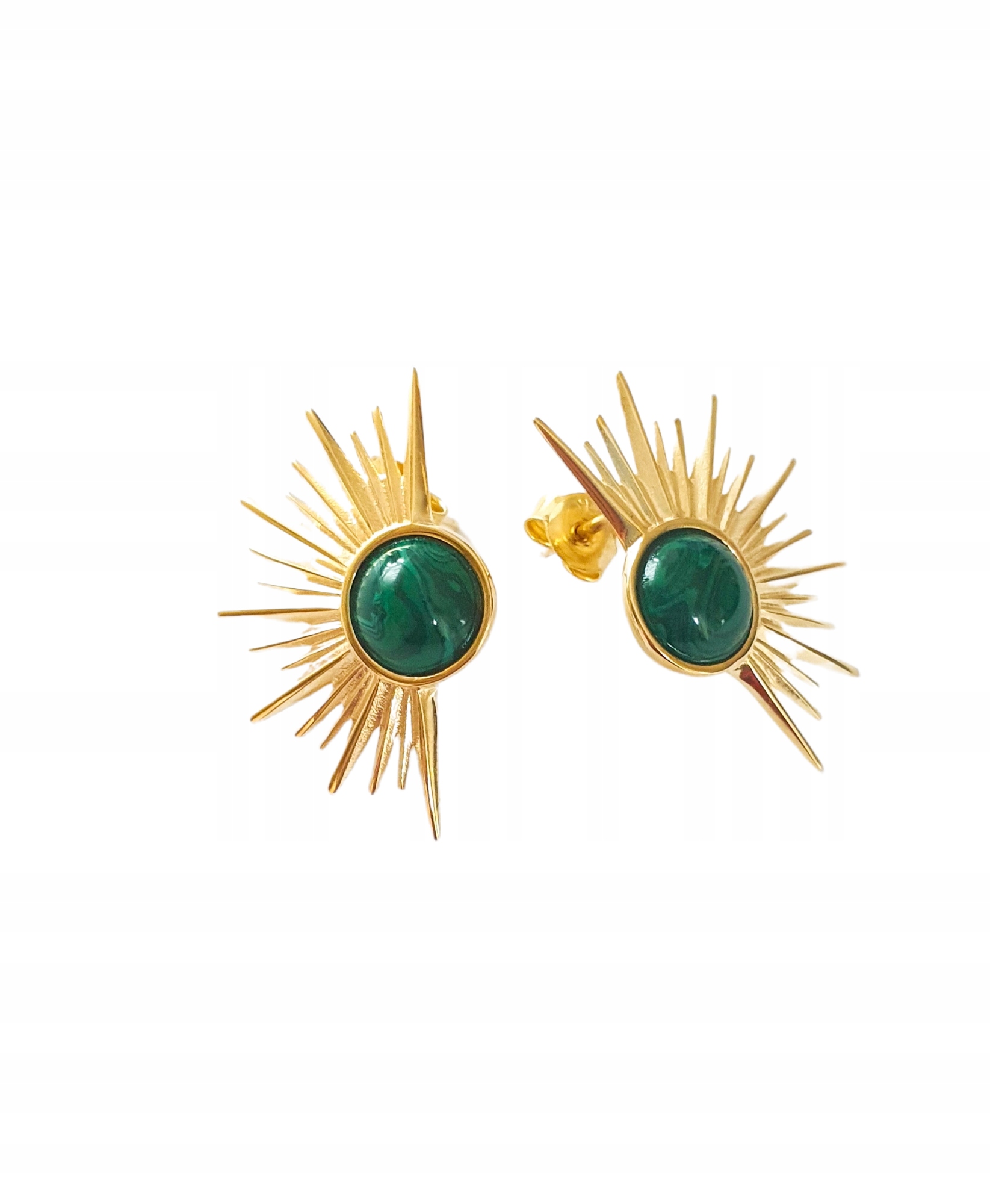 Дуже вражаючі позолочені сережки з мотивом напівсонця. Дуже сучасний дизайн підходить як для повсякденного носіння, так і для особливих випадків. Вся річ була виготовлена зі срібла 925 проби, позолочена 24-каратним золотом і прикрашена зеленим МАЛАХІТОМ. Оригінальні сережки, які гарно прикрашають і надають всьому справі оригінальний стиль і блиск.