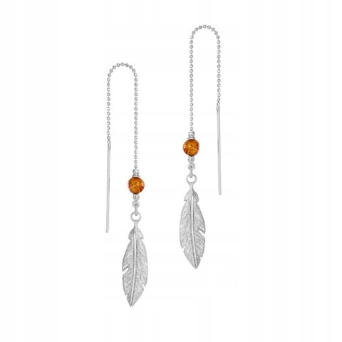 СРІБНІ СЕРЕЖКИ З ПІР'ЯМИ І БУРШТИНОВОЮ КУЛЬКОЮ