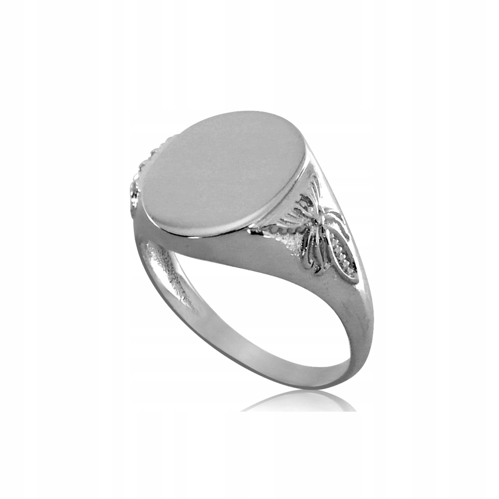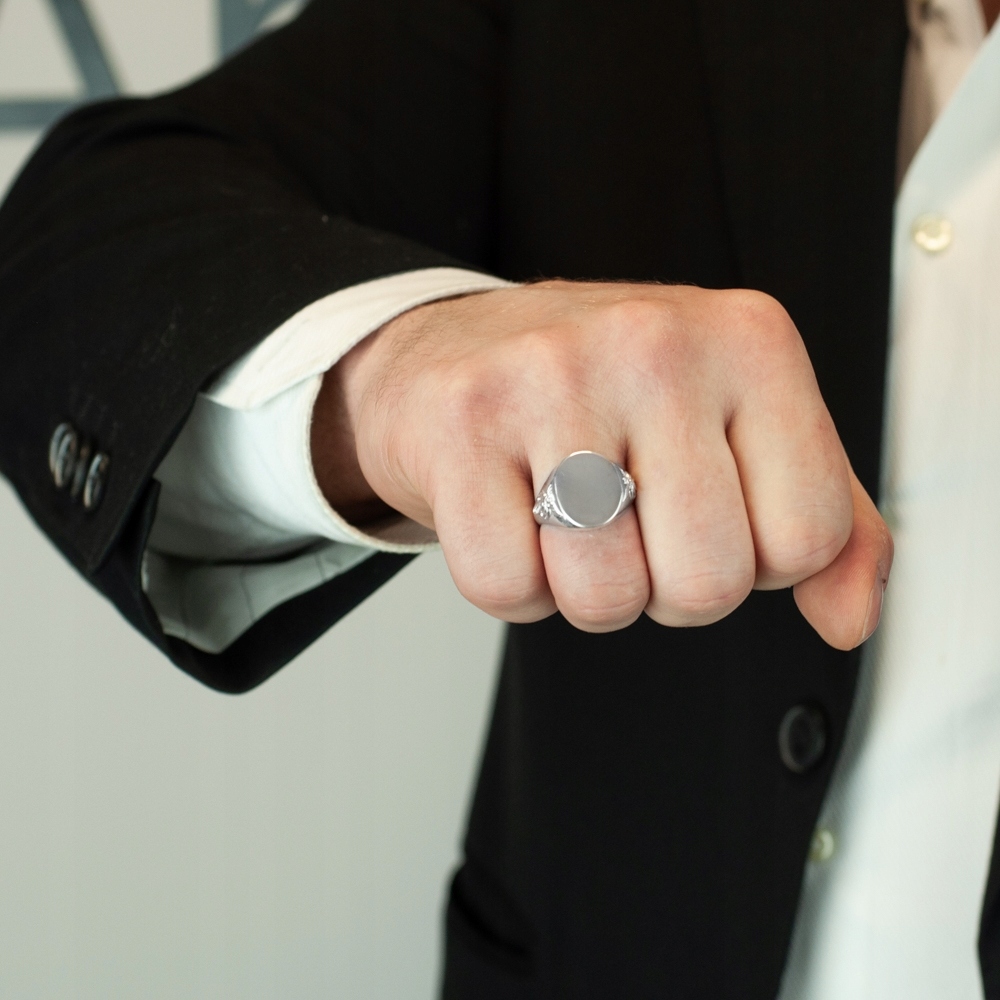 Ця надзвичайно вражаюча модель каблучки з печаткою, прикрашена красивими бічними прикрасами, виправдає очікування кожного чоловіка, який цінує елегантність і клас. Великий гладкий циферблат відполірований, як поверхня води. Ми можемо зробити на ньому ефектне, індивідуальне гравіювання, яке зробить печатку унікальним сувеніром! Широка планка для печатки забезпечує високий комфорт при носінні. Велика поверхня всередині рейки також підходить для гравіювання.