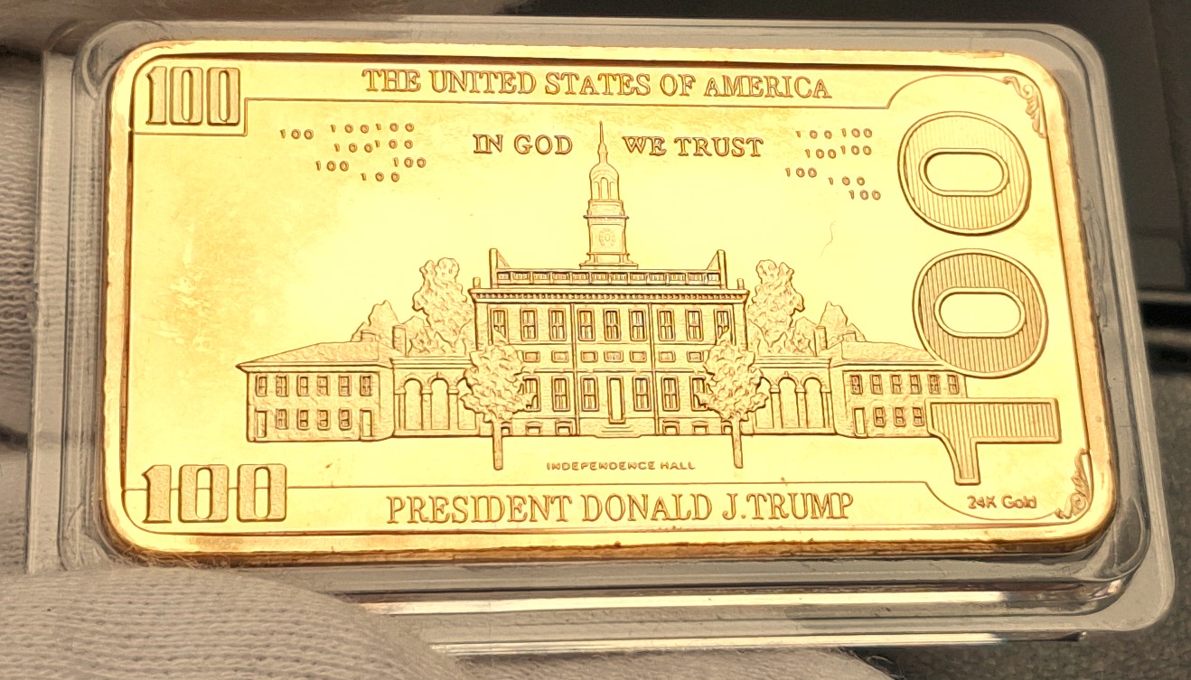 США, Золотий злиток, 100 доларів, 999/1000 ЗОЛОТО, позолочена копія, Д. Трамп