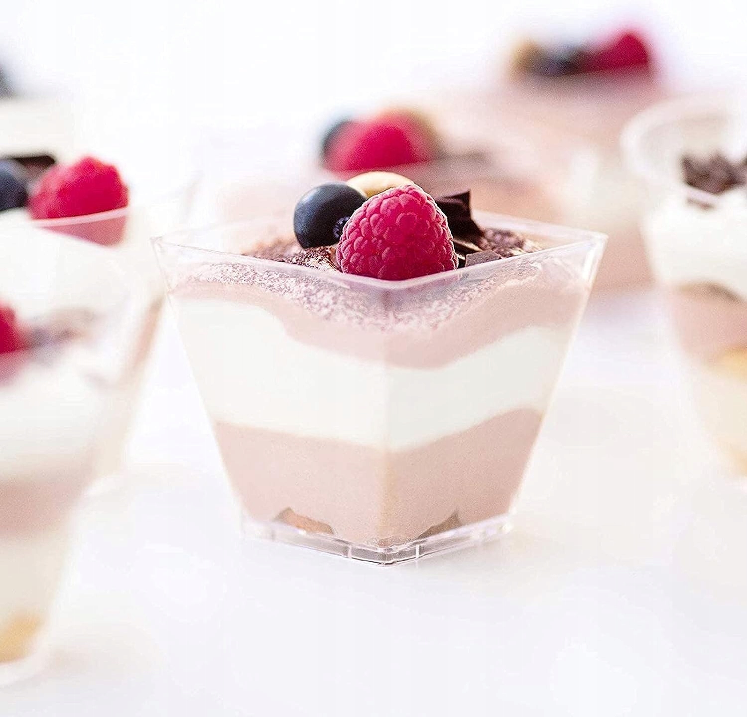 - Прозорі пластикові склянки для десерту: прозорий колір показує, що ваші інгредієнти багаті, тож ваші вершки, морозиво, чізкейк, солодощі та закуски можуть повністю задовольнити ваш апетит. li>