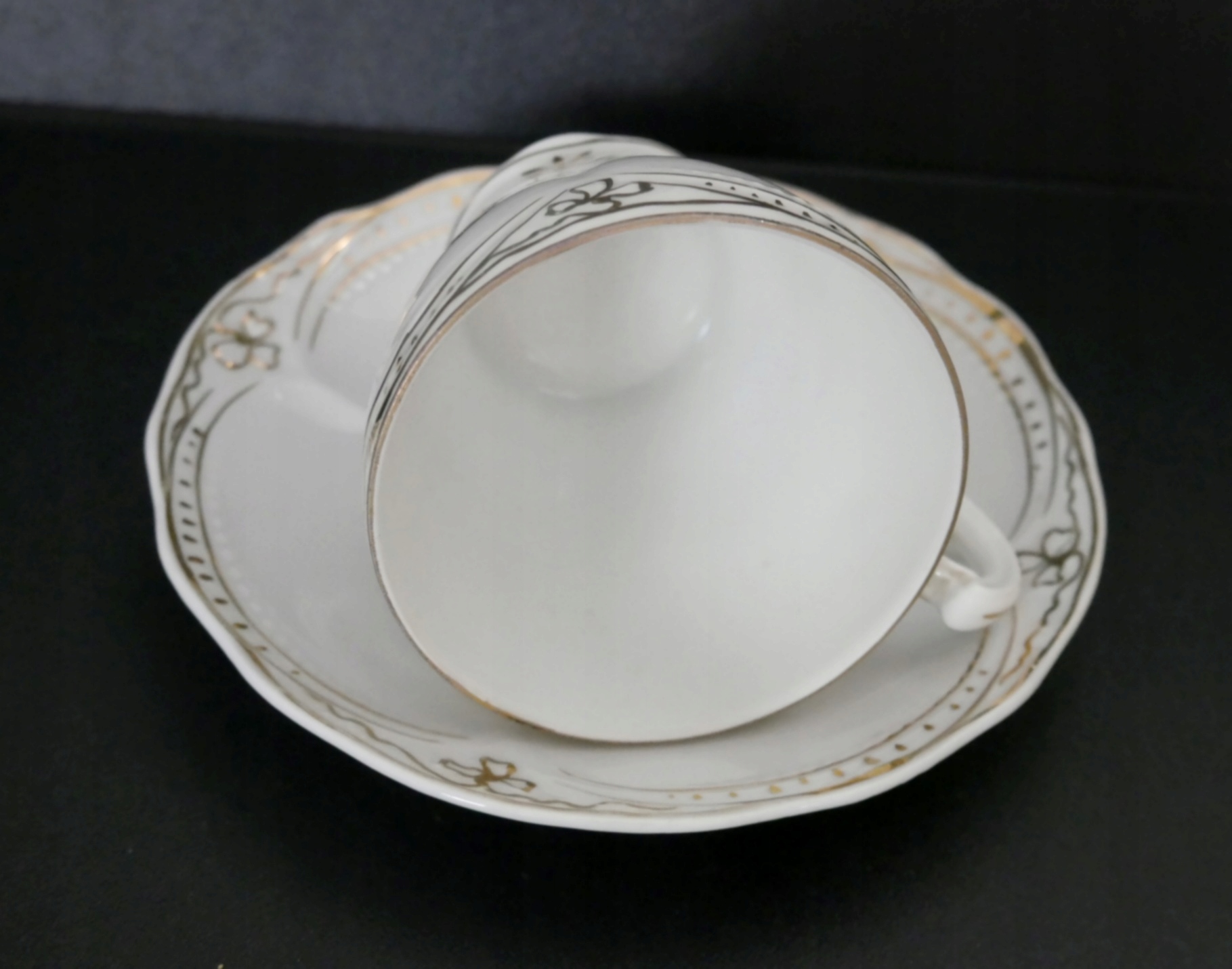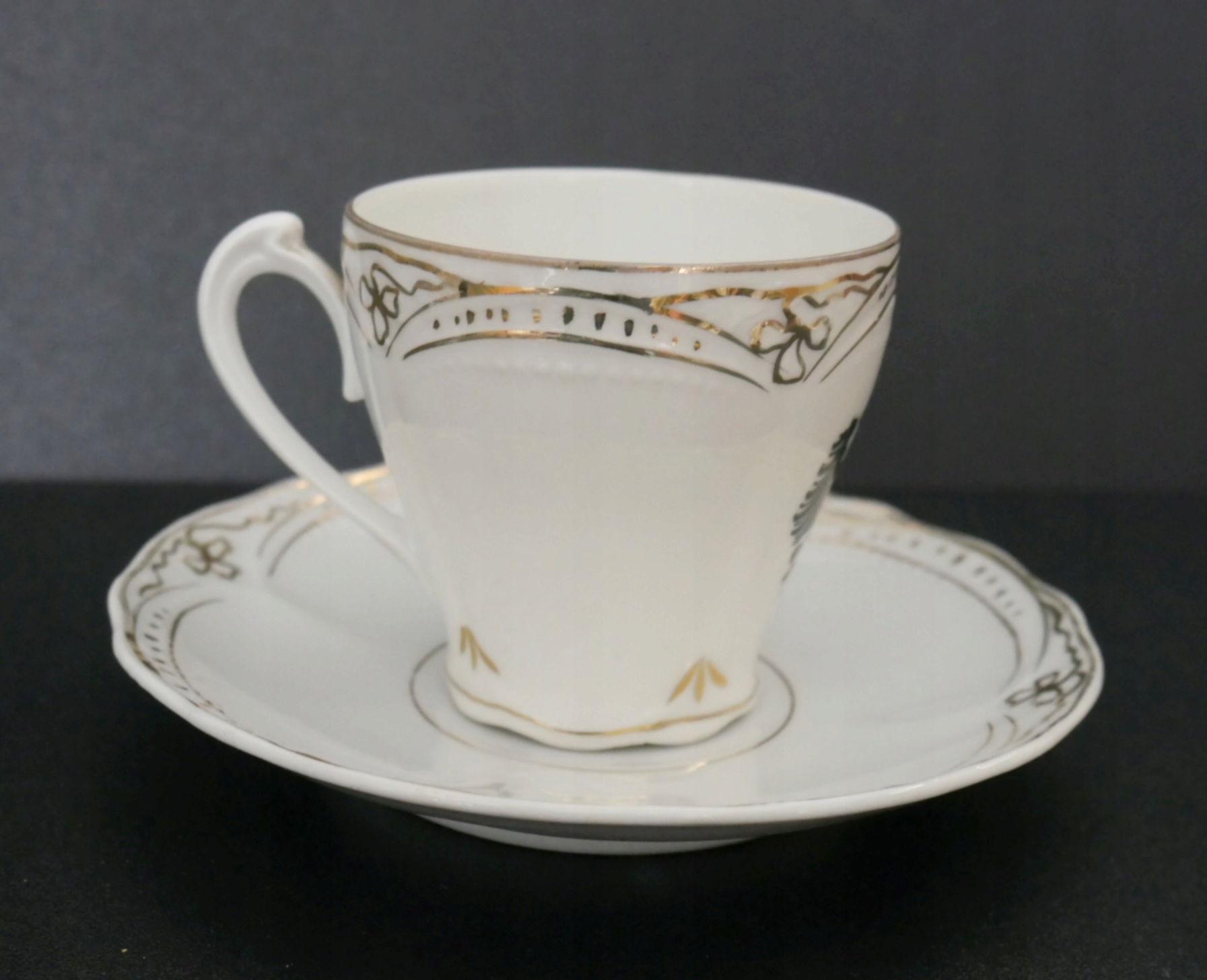 чашка з блюдцем, з намальованим гербом, без підпису, цифра на чашці