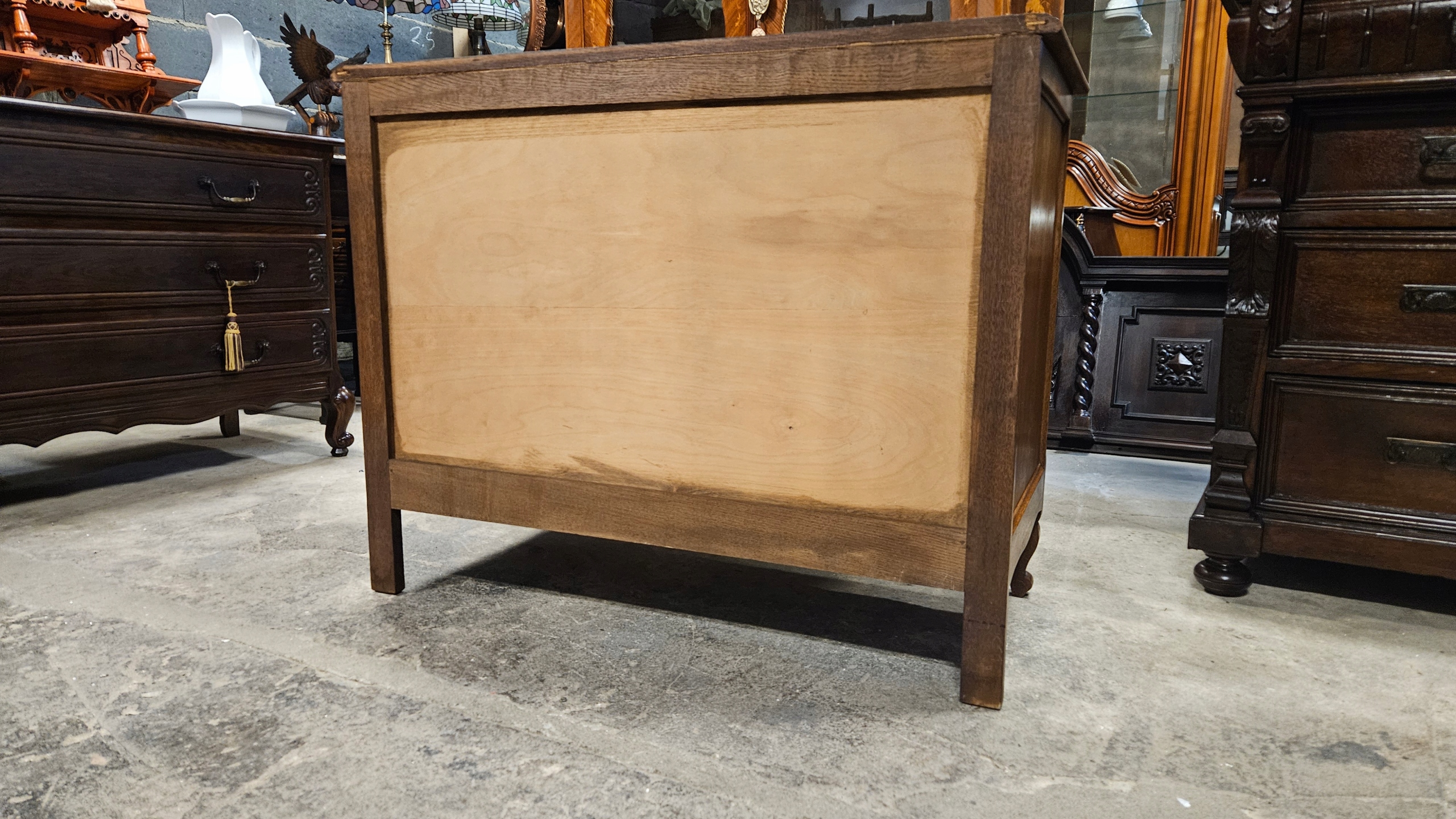 Здорова, міцна деревина. Три великі шухляди, упаковані деревини, фурнітура: латунні ручки.