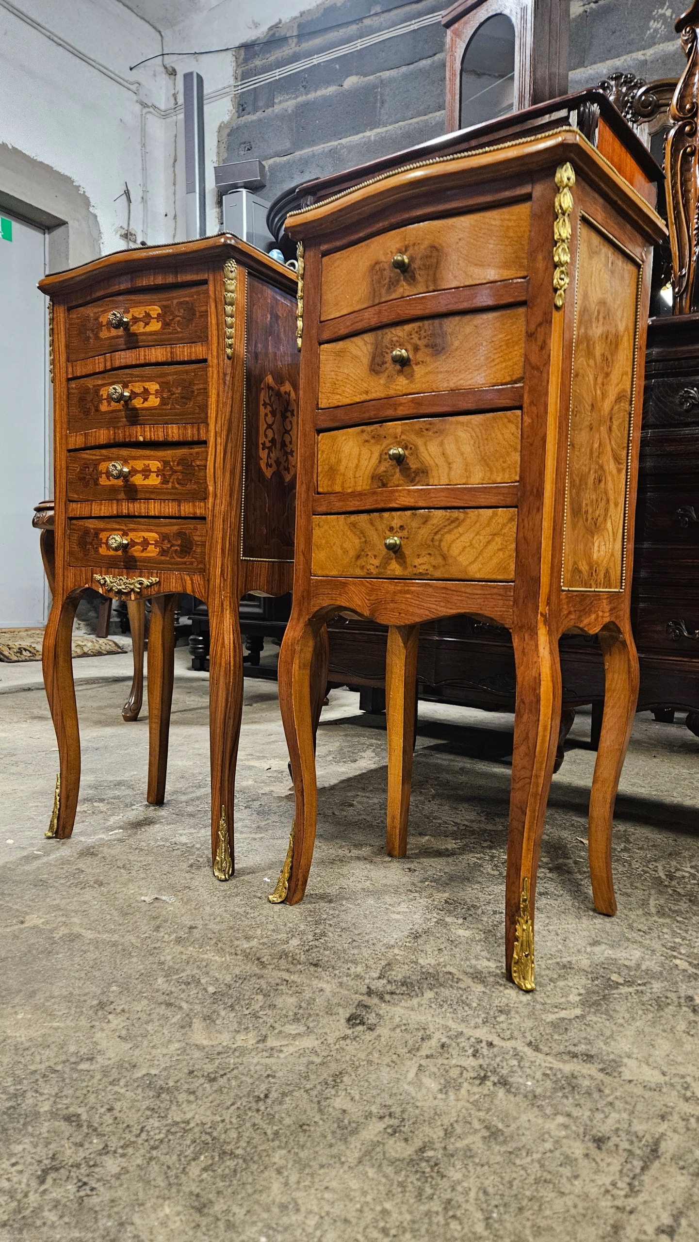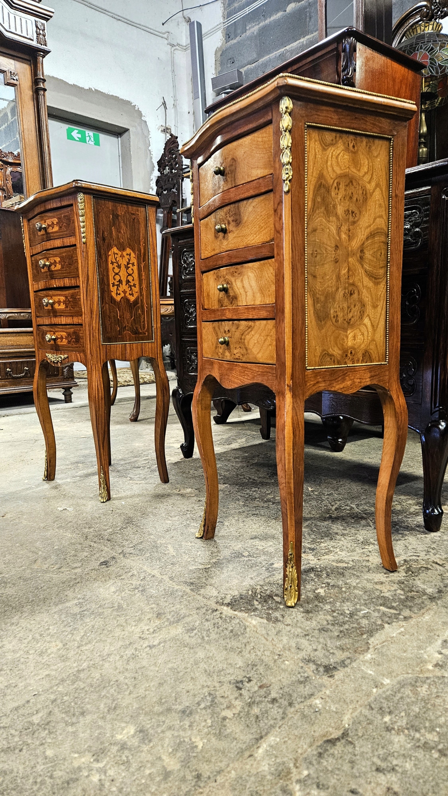 Зроблено з дерева, шпонований інкрустований, прикрашений латунною, обробкою. Немає слабкої, - стабільна. Ноги зігнуті.