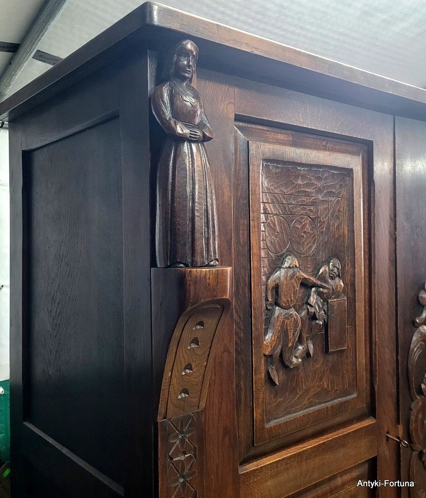 Дуже приємна та цікава стара скринька з багатим скульптурою з розмірами: 150x60 см висотою 160 см, два -дорожні, ефективні замки 1 ключ включено. 4 невеликі ящики всередині праворуч. Пошкодження у правій двері - як на фотографії. Датований другій половині 19 століття. Можливість транспорту чи особистої колекції.