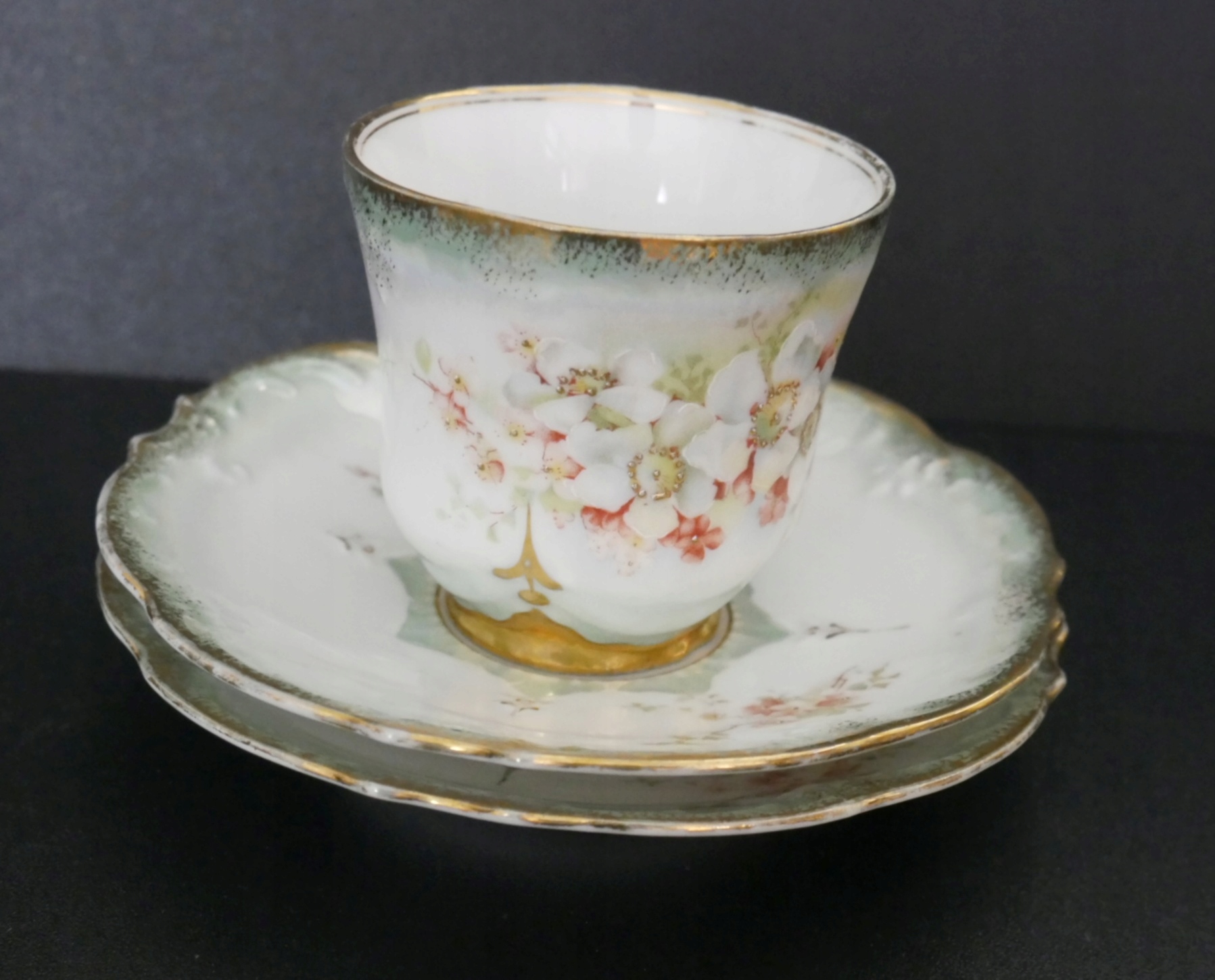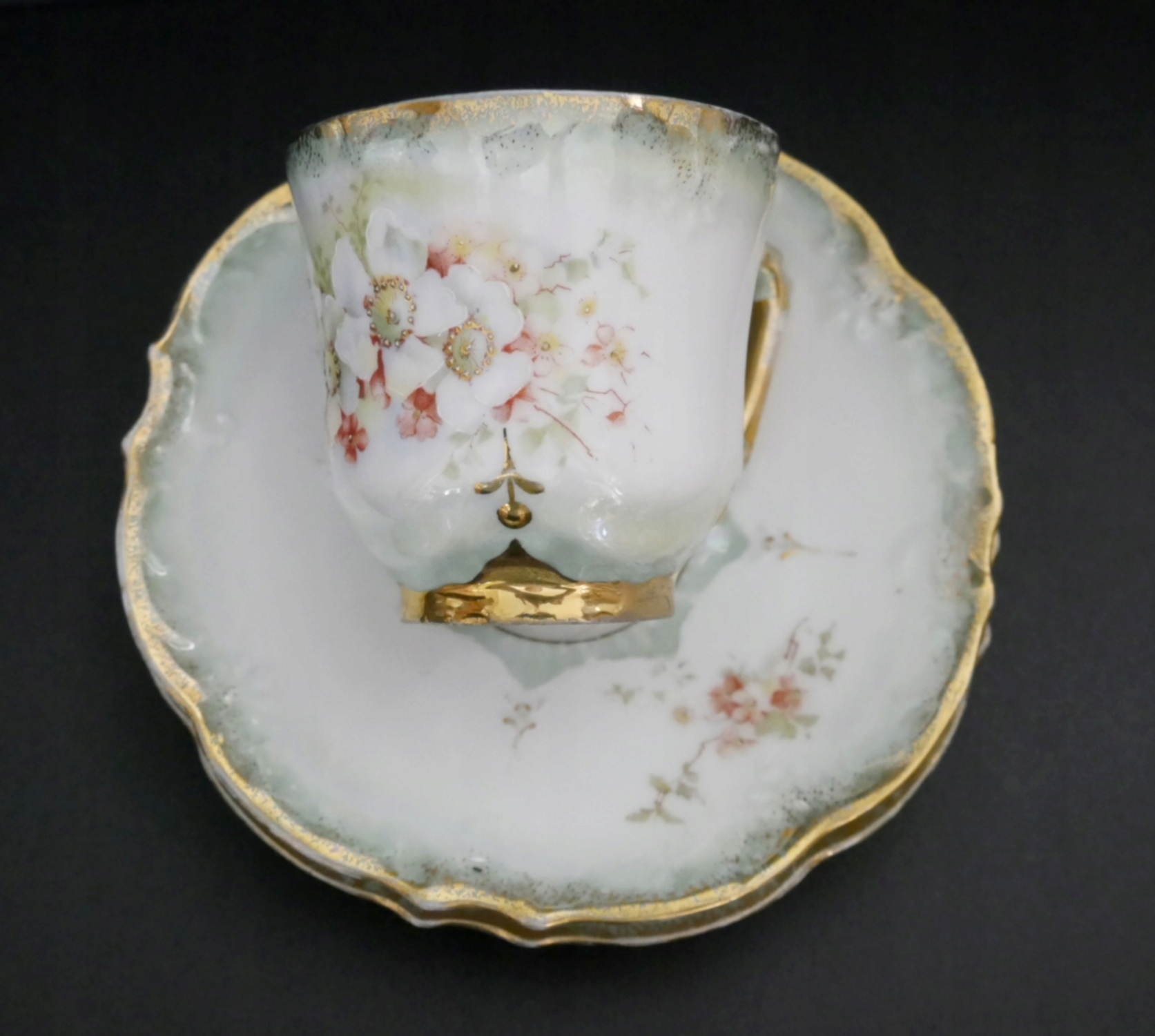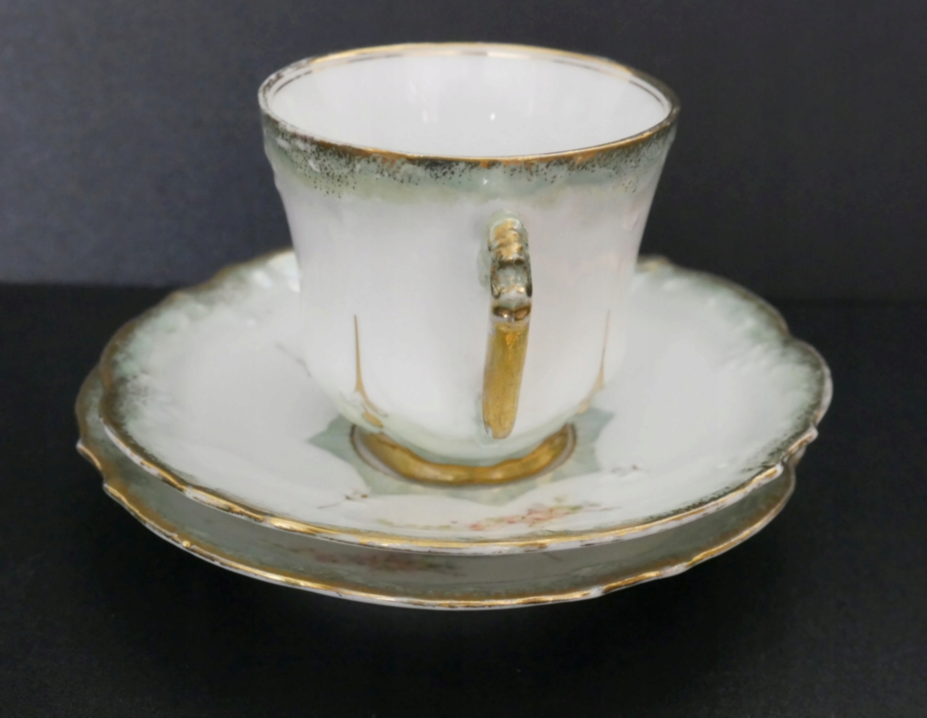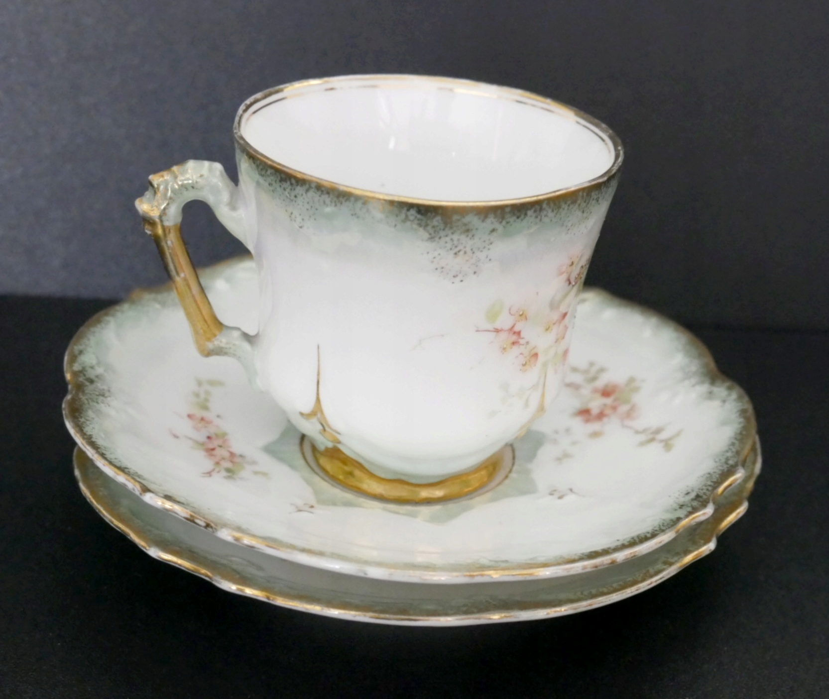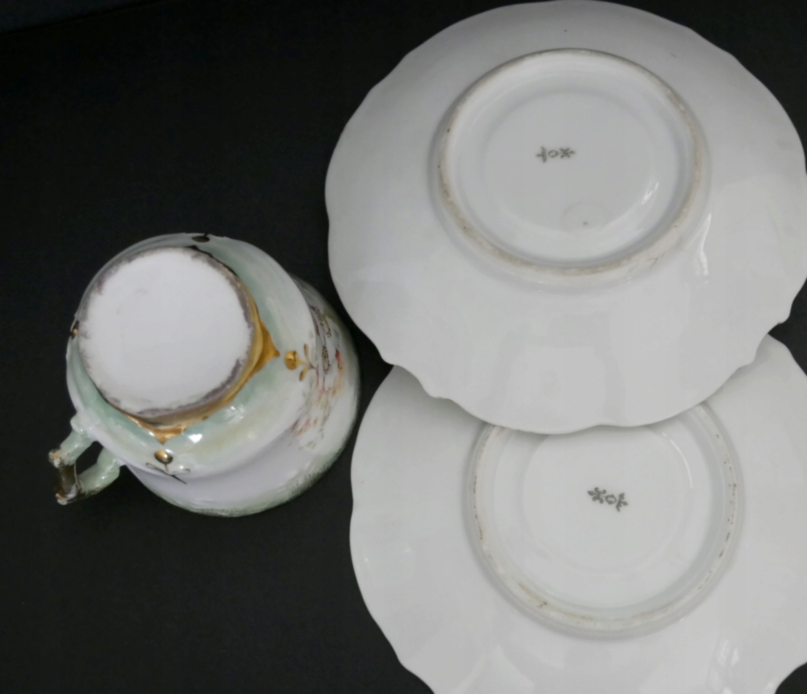 набір старий, блюдця Оме + пошкоджена чашка, в заголовку я написав, позолочена основа трохи скошена, покрита позолотою, в іншому верх цілий, але зі значними потертостями до позолоти, на другому блюдці є скол край - фото
