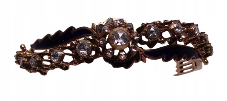 СТАРИЙ ЗОЛОТИЙ БРАСЛЕТ КОЛЕСО З ДІАМАНТАМИ РОЗЕТКИ ТА СИНЯ ЕМАЛЬ. Браслет із золота приблизно 0,500 - 12 карат (перевірено на спектрометрі) Цікаві клейма, що нагадують мушлі на застібці. Вага 21,690 г. Обхват кола всередині 16,3 сантиметра (5 х 5,6 см.) Ширина прикраси / рамки 1,45 сантиметра, "висота" 1,04 см. - на найвищому місці. Браслет оправлений 19 природними діамантами загальною вагою приблизно 1,20 карата. Голландські розетки та Антверпенські розетки. Колір H – I чистота SI1 – SI2 Продукт має сертифікат експерта та оцінку 18 000 злотих. Дизайн ювелірних виробів 1940-х – 1950-х років – XIX/WW століття