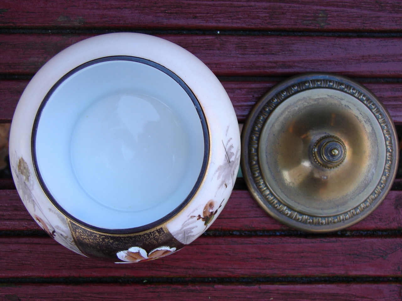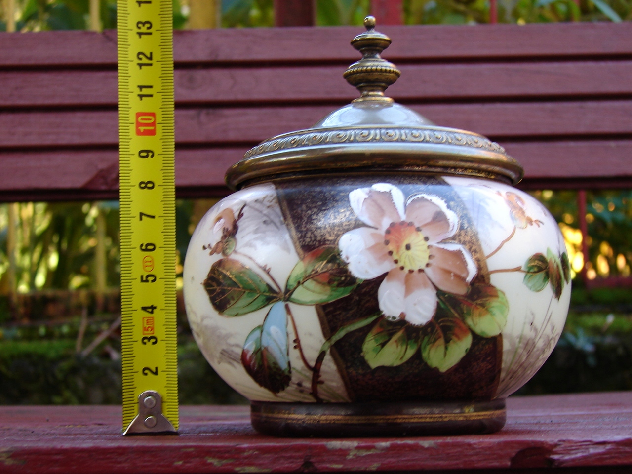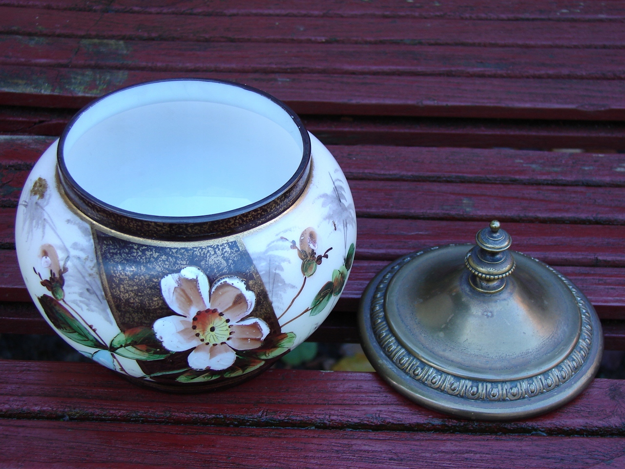 Стара скляна коробка з-під цукерок, прикрашена квітковим мотивом, розписаним вручну, кришка з декоративної латуні.