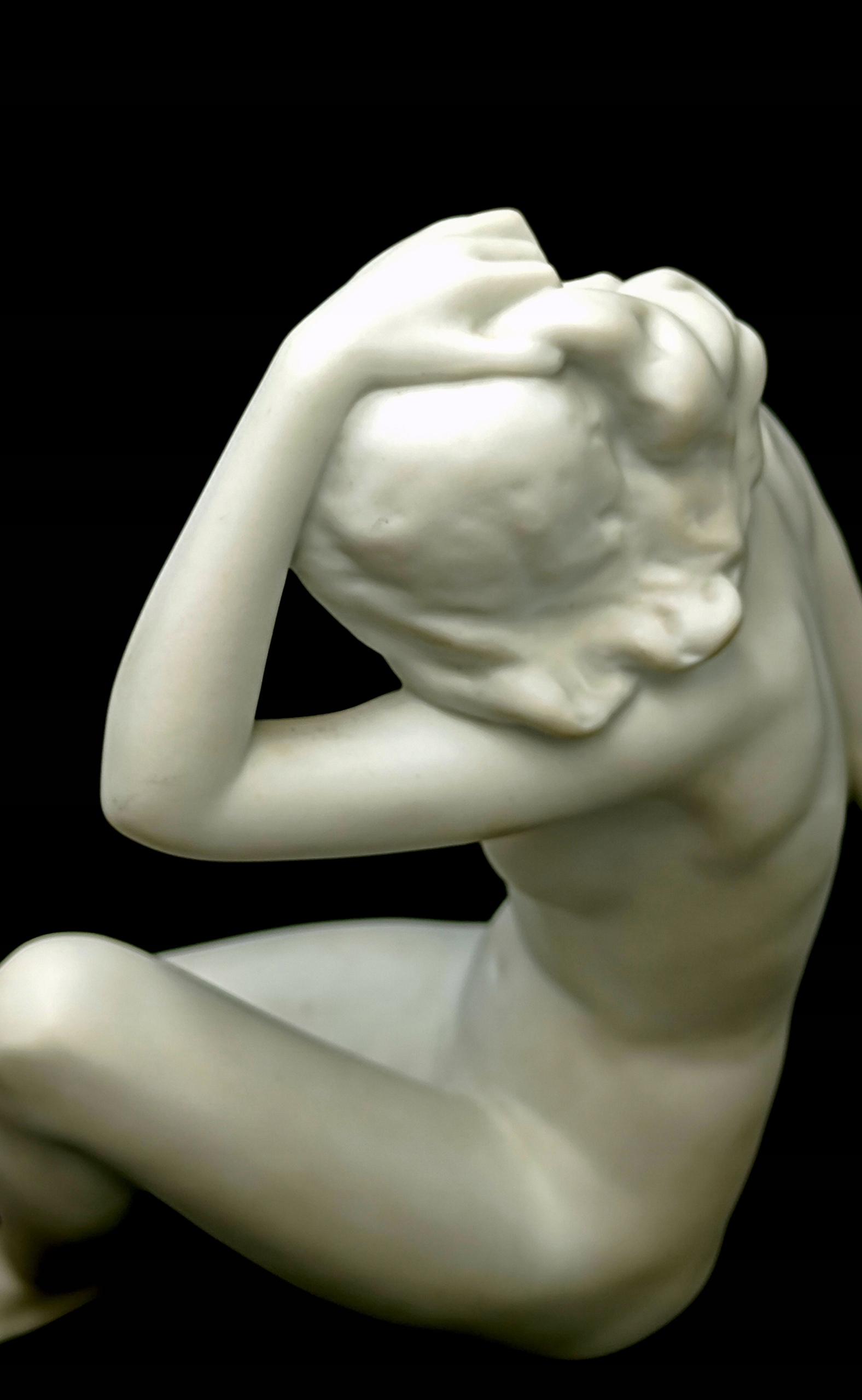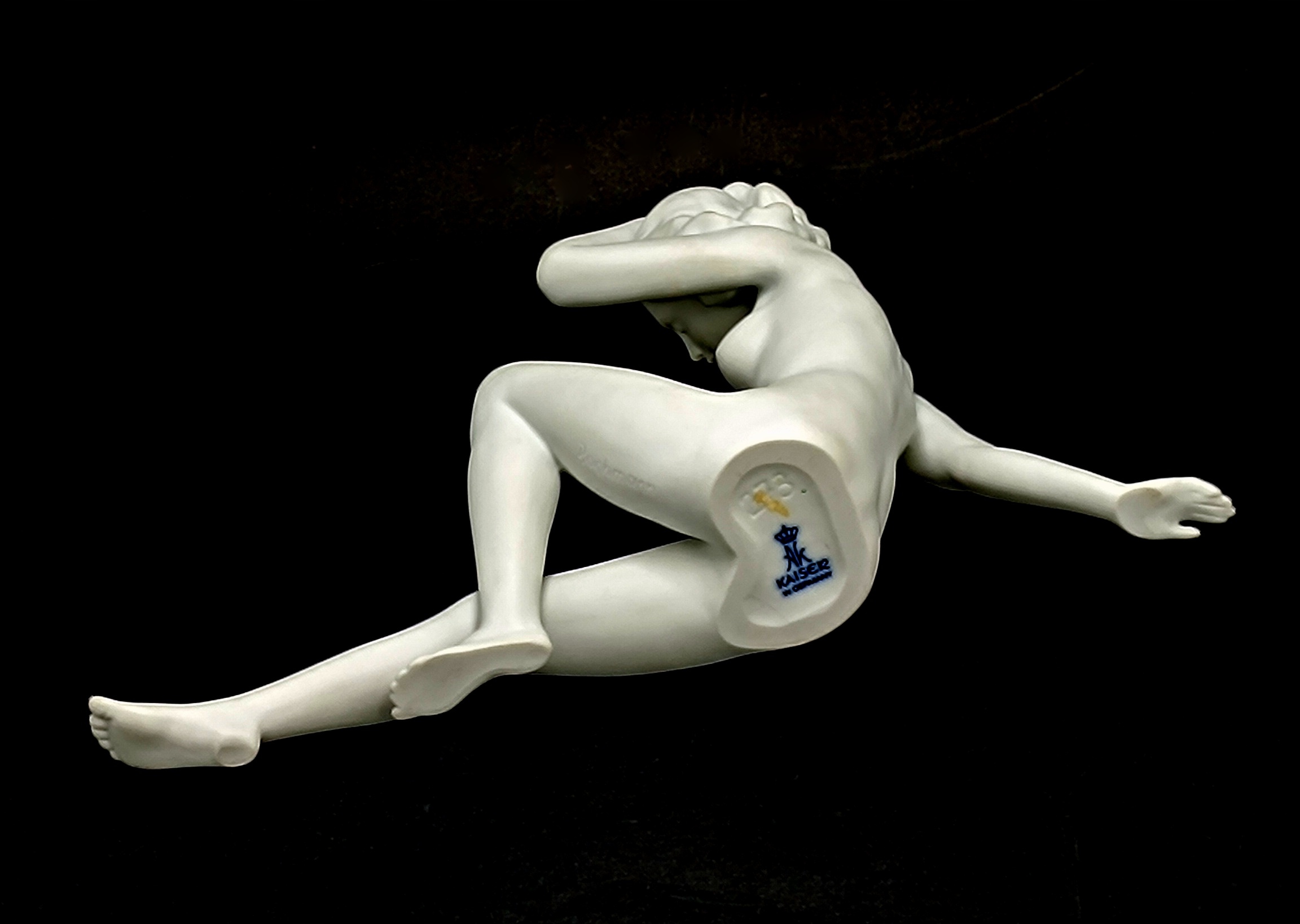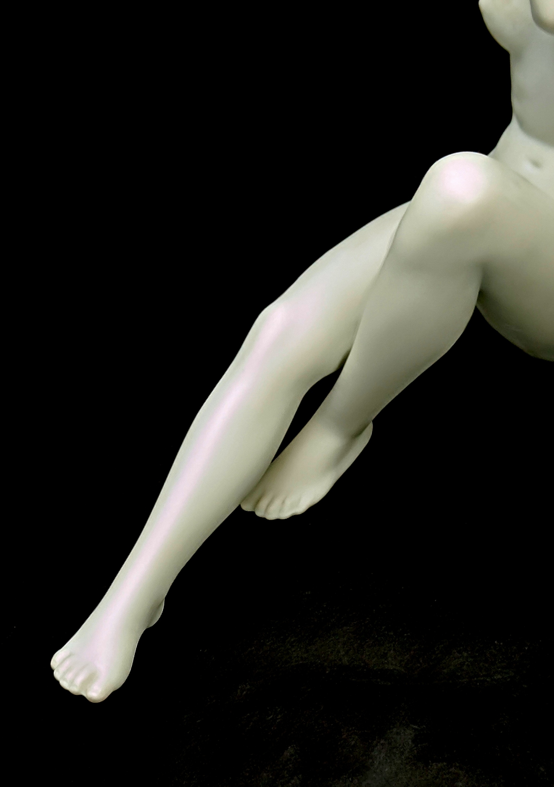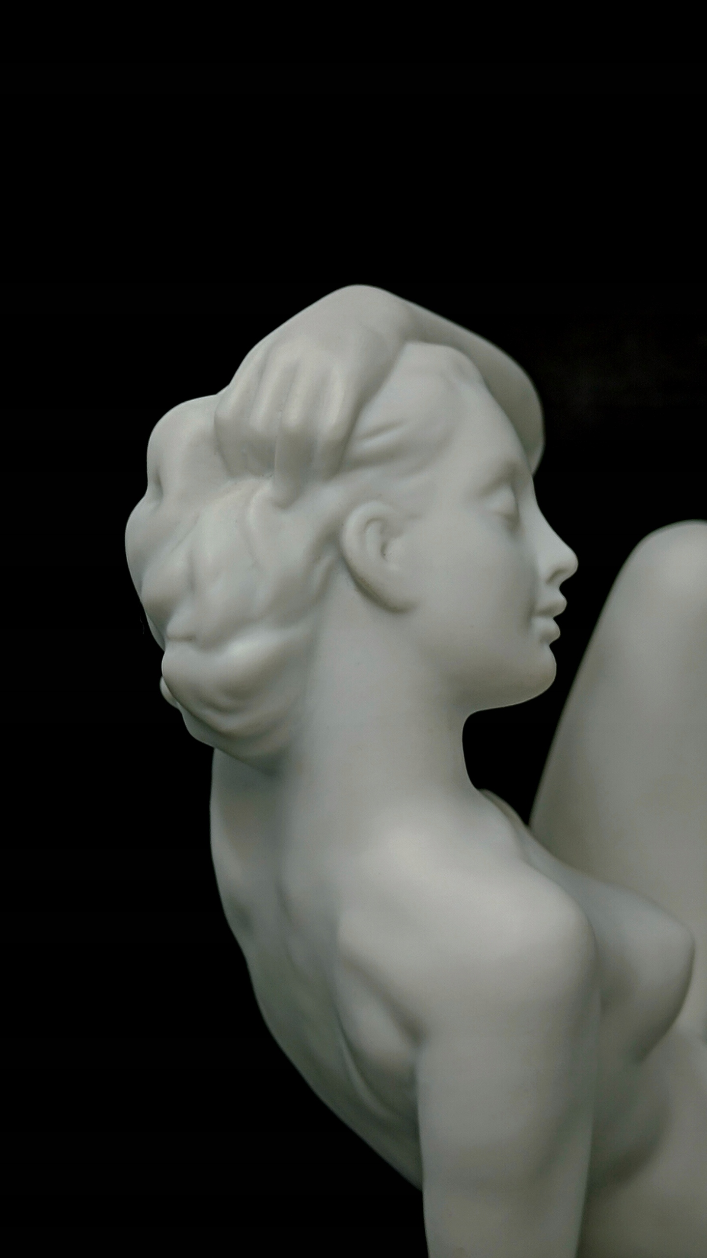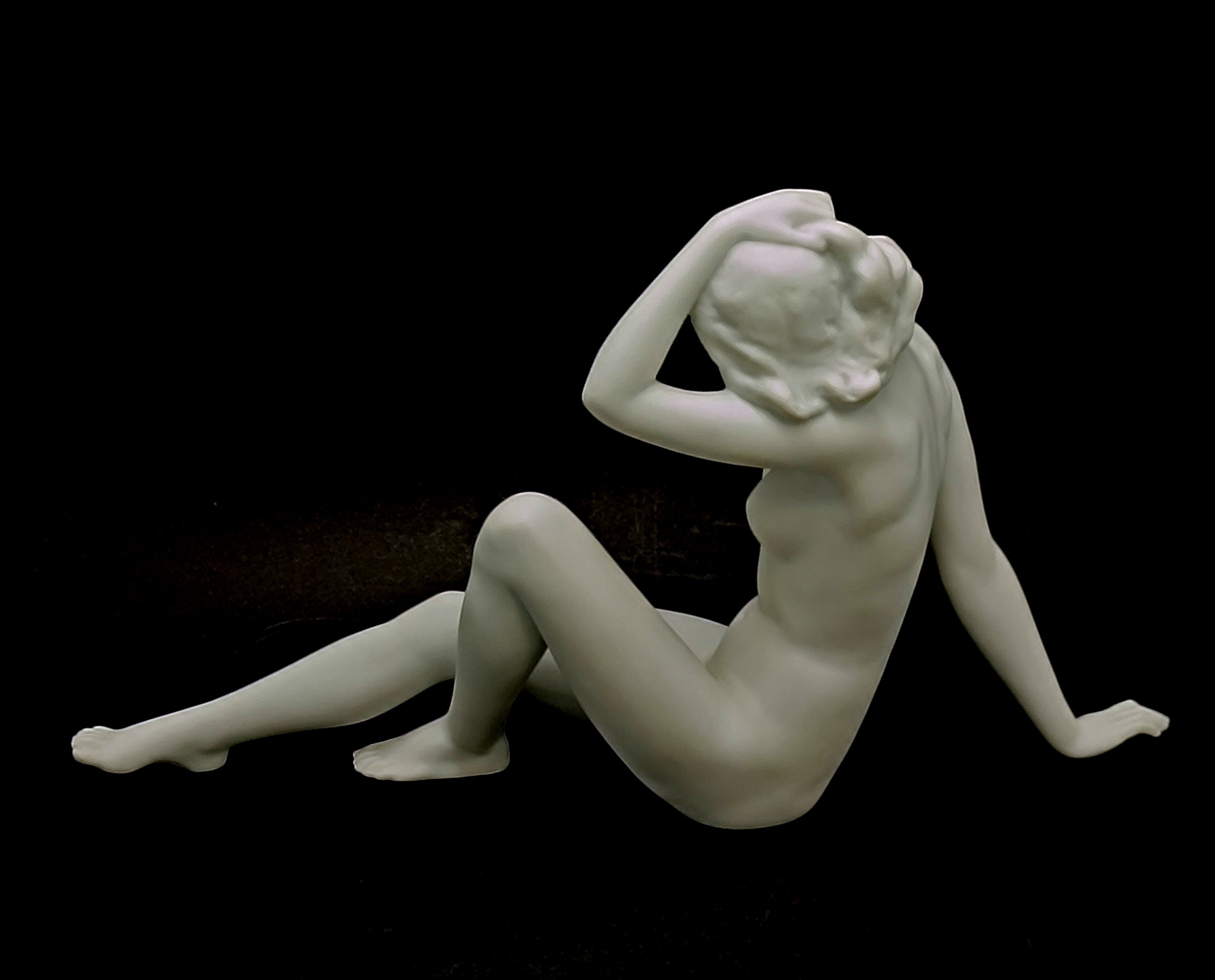 Фігурка була виготовлена з високоякісної бісквітної порцеляни (не глазурованої) білого кольору. На ньому зображено оголену жінку, яка сидить з однією випрямленою ногою та зігнутою іншою, спираючись однією рукою, а другою тримаючи волосся. Виглядає неймовірно витончено і порадує вас своєю красою і жіночністю. Знизу є підпис, який використовувався в 1960-1990 роках.