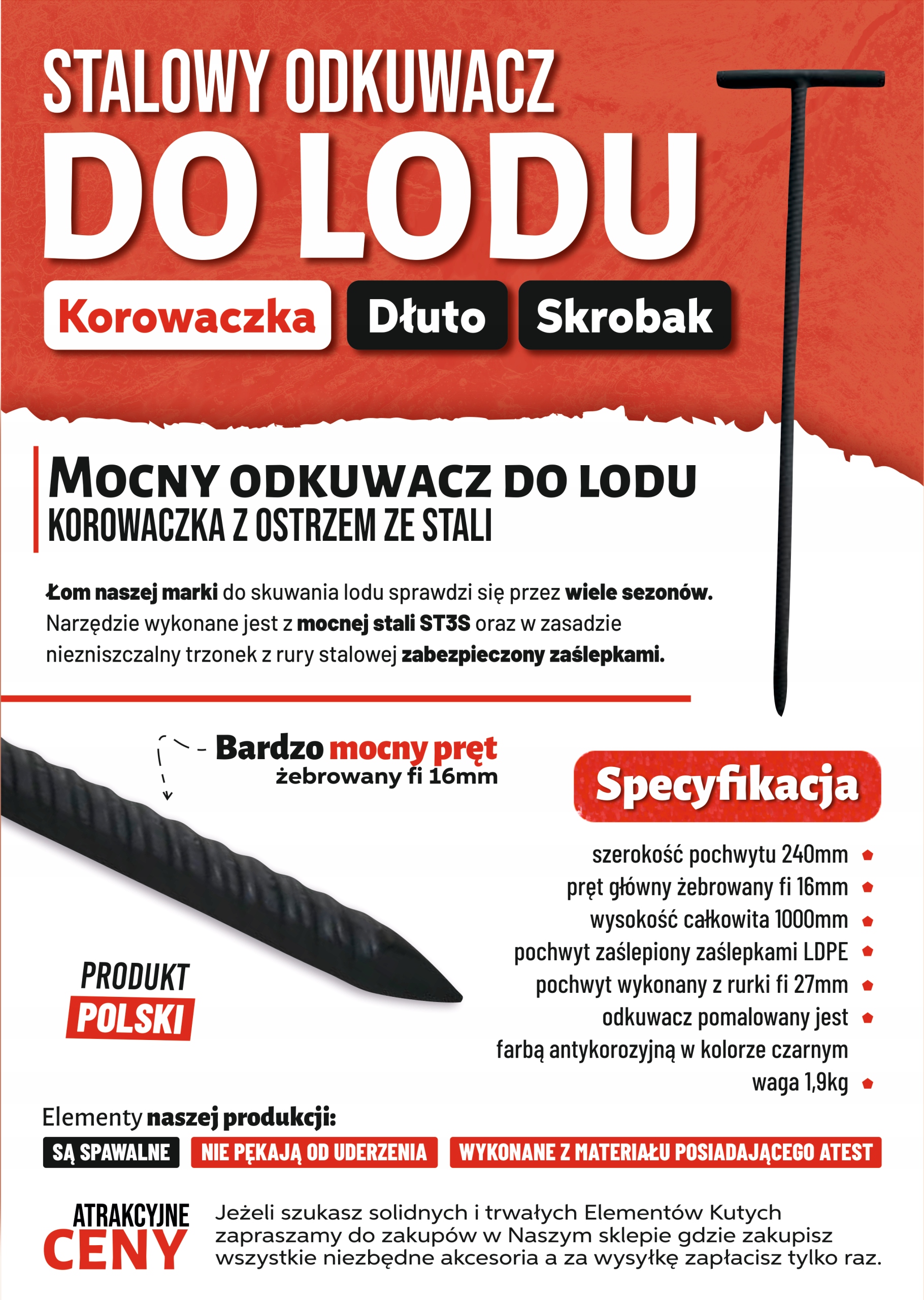 Лом для подрібнення льоду від нашого бренду буде добре працювати протягом багатьох сезонів. Інструмент виготовлено з міцної сталі ST3S і практично незруйнованого стрижня сталевої труби, закріпленого ковпачками.