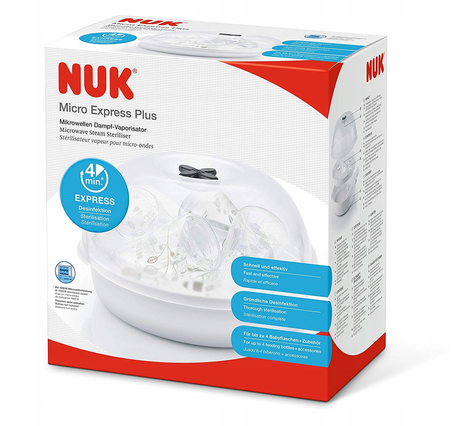 Ефективно дезінфікує пляшки та аксесуари лише за 4 хвилини, підходить для всіх пляшечок NUK.