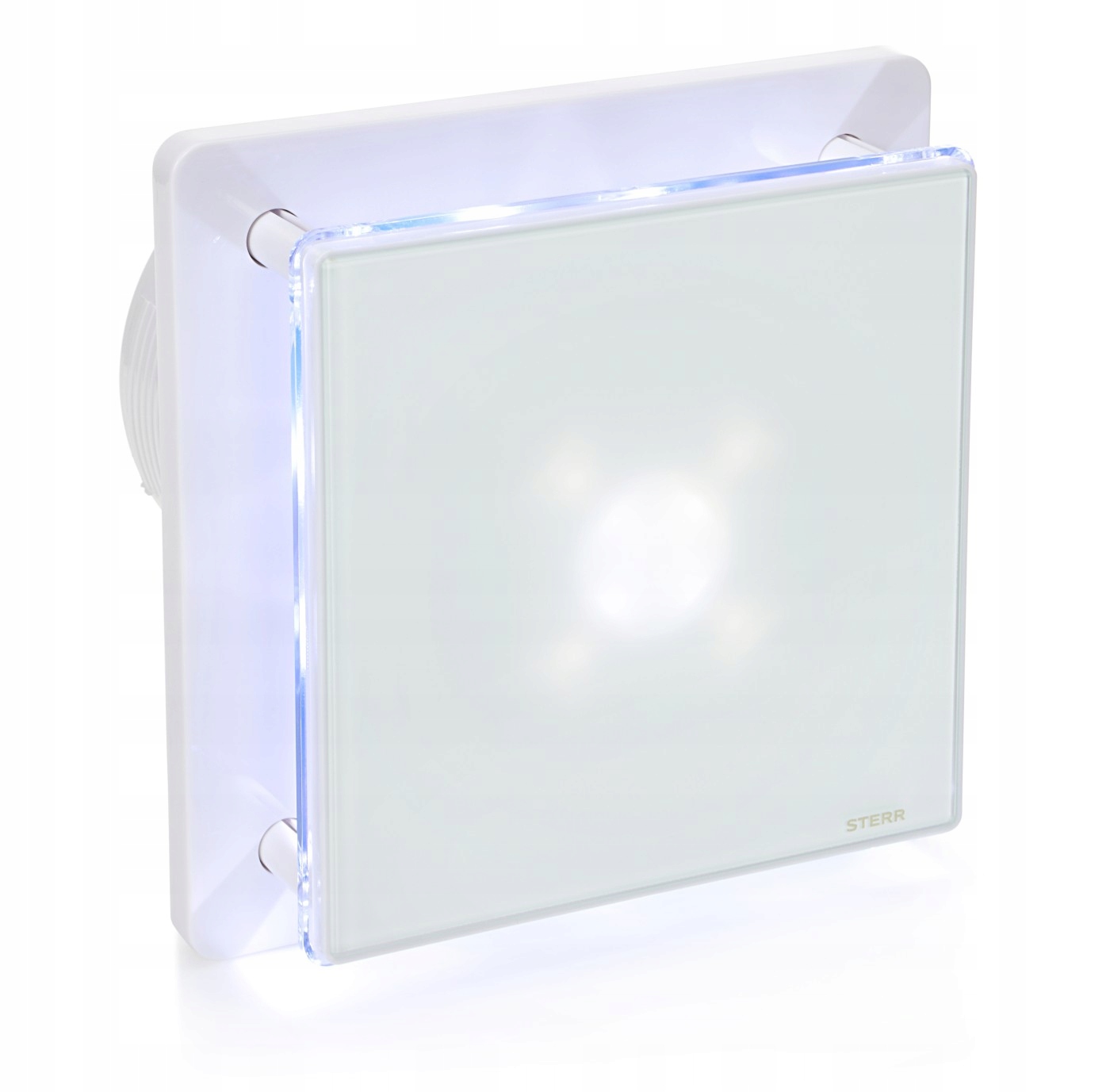 Вентилятор для ванної кімнати зі скляною передньою панеллю, білим світлодіодним підсвічуванням, таймером і зворотним клапаном. Зі смаком і сучасним виглядом.