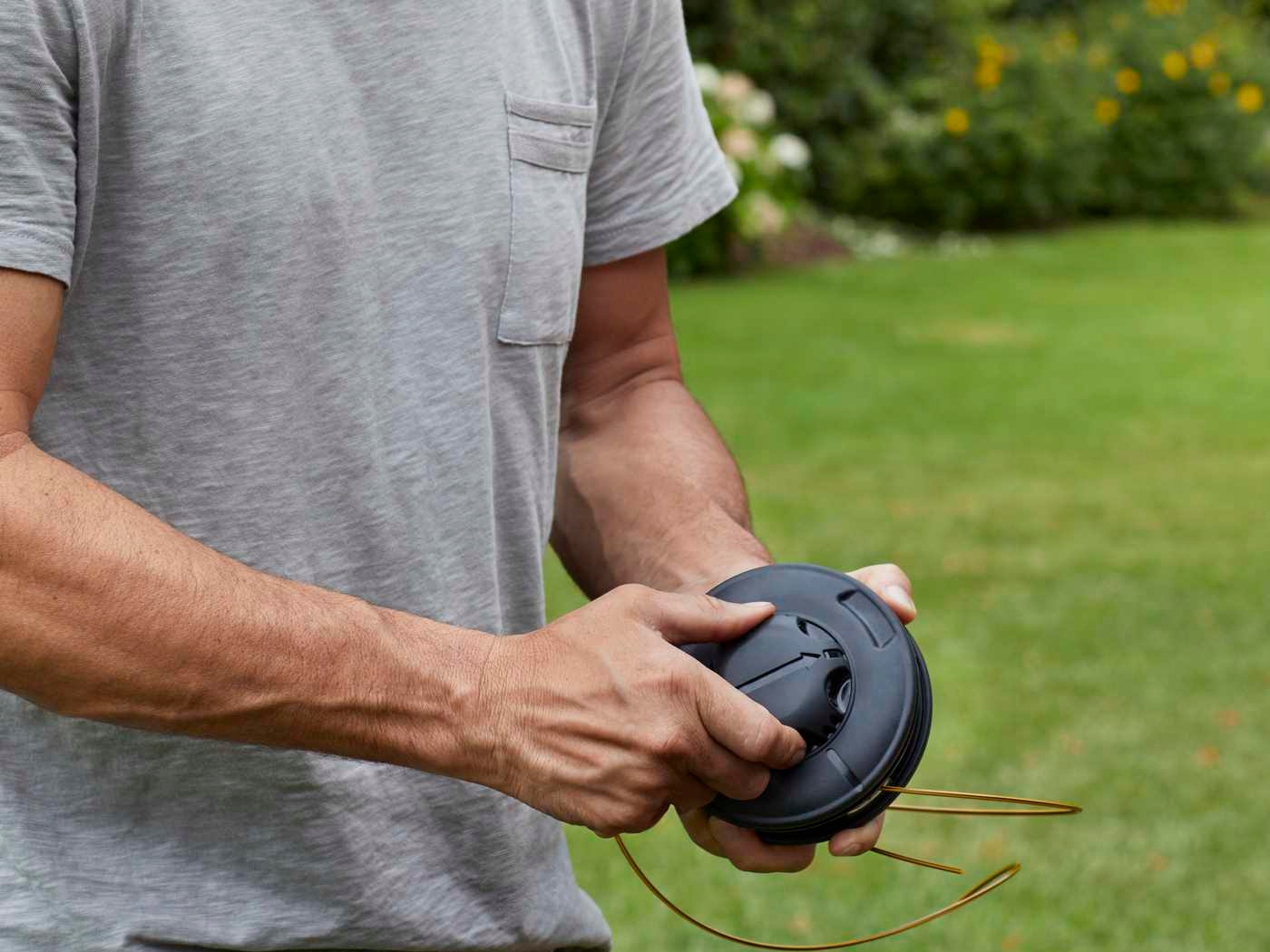 Голова обладнана автоматичною системою втягування шнура Tap & Go, коли вона притиснута до землі. Це робить роботу з косою надзвичайно зручною та не потребує зайвих зусиль. Скошування тримерною головкою з робочим діаметром 380 мм є ідеальним рішенням для вирівнювання країв газону та фінішних робіт навколо дерев, садових доріжок, поверхонь уздовж стін або під садовими лавками.