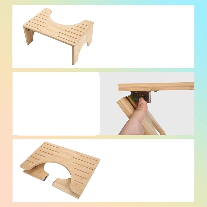 - Збереження дизайну - туалетний табурет складений і не вимагає встановлення. Перед використанням просто витягніть ногу бамбукового туалетного крісла і знову складіть його після використання, щоб заощадити місце у ванній кімнаті.