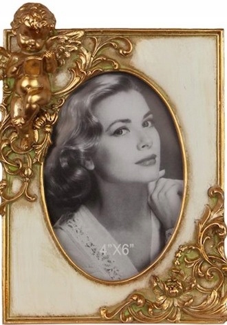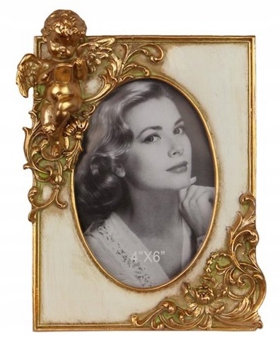 Приваблива фоторамка. Виготовлена з золота-екрю, прикрашена декорами та амуром у короні. Завдяки своїй чудовій формі розміщена в ньому фотографія виглядає елегантно, і все це неодмінно стане прикрасою вашого дому або чудовим подарунком. Рамка оснащена опорою ззаду.